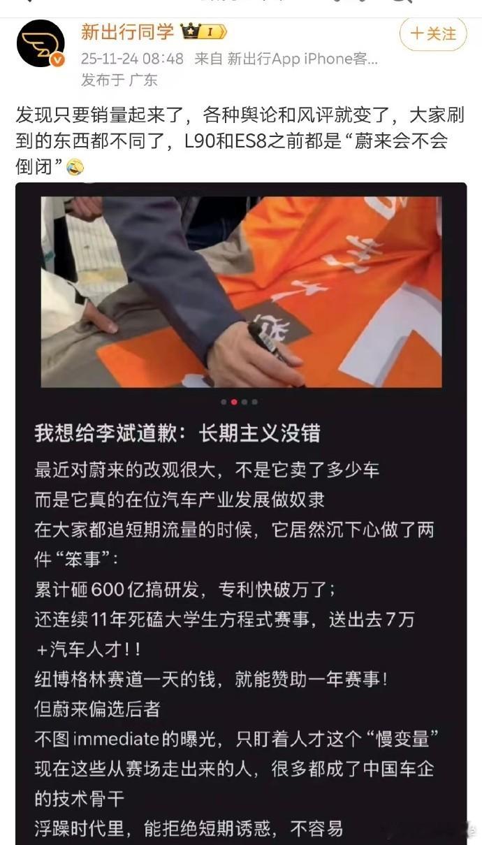 在之前逆风狂刮的阶段,但凡说点正面的,下面不是一阵疯狂嘲笑各种喷?观点无非那么几个:粉饰太平,还不跳船,水蠢电坏,就是有问题你别掩饰了。这些ID有些我至今仍然有印象,哪个不是在我微博下面放个屁就走人的,现在风向一转,全都消失了,仅有的几个连道歉都没有,也当之前说过的话完全不存在,有的还真买了辆ES8,还遮遮掩掩说我本来不想买,是老婆让买的......那个时候,各种周榜裹挟着大V的各种言论,连“长期主义”几个字都要嘲笑,海陆空全方面舆论打击你,某位暴论老师在周榜出来会连发N个视频。但是结果又如何呢?那个时候那么嚣张的言论,能抵挡住汽车行业的周期性变化吗?究竟是谁跳船了?究竟是谁鼓吹的智驾关门论,X强论,换电末日论,三瓜两枣论,回旋镖论,速胜论,还有最可怕的倒闭论,让谁真正倒闭了?最后结果又如何了,风向一转结果都当之前的言论不存在了?然后某些KOC拍拍屁股换一家继续吹?连措辞就基本一样还是那套东西想获得新的一波商单,商业模式如此固定真的不考虑一点进步吗?之前让别人跳船的人,自己先跳船了。之前鼓吹智驾关门的人,结果发现智驾开门了。.......岁月就是这么史书的啊!