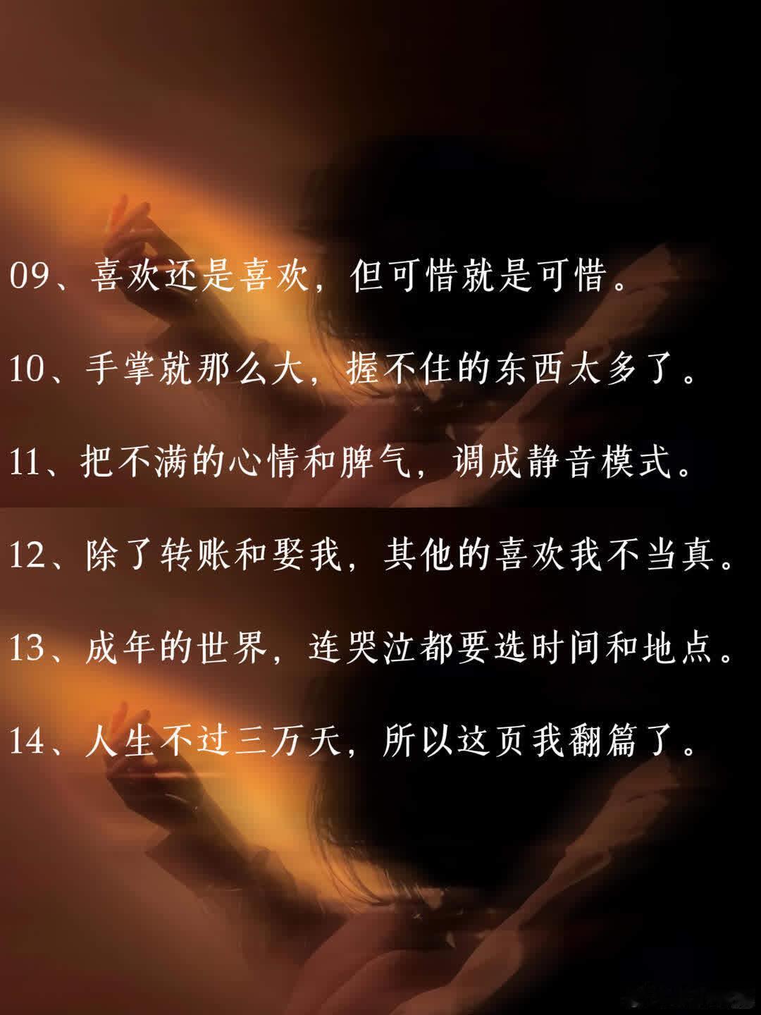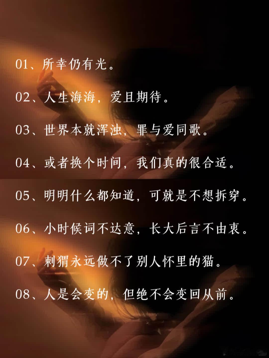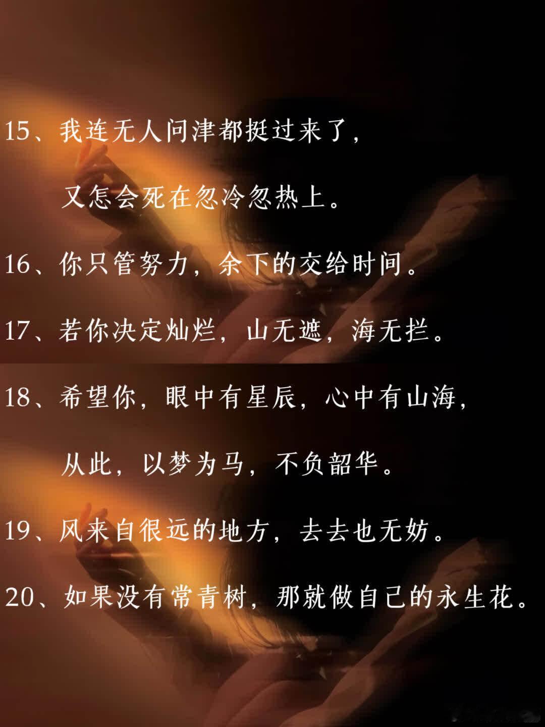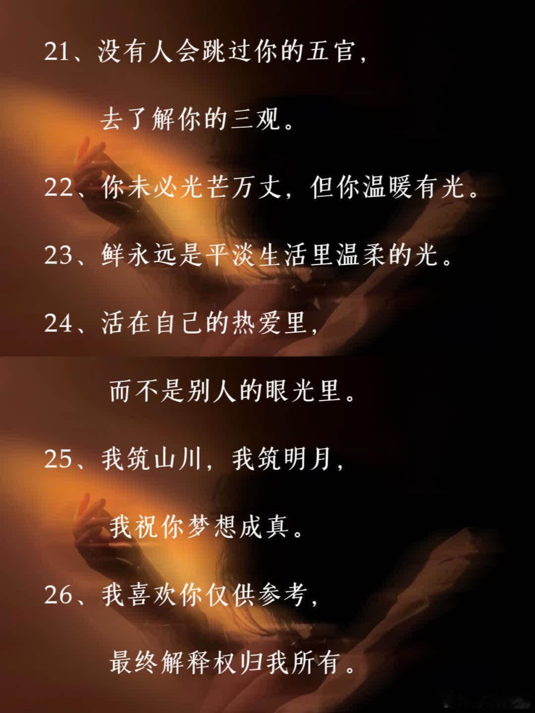 “直抵你心,句句封神” 01、所幸仍有光。 02、人生海海,爱且期待。 03、世界本就浑浊,罪与爱同歌。 04、或者换个时间,我们真的很合适。 05、明明什么都知道,可就是不想拆穿。 06、小时候词不达意,长大后言不由衷。 07、刺猬永远做不了别人怀里的猫。 08、人是会变的,但绝不会变回从前。 09、喜欢还是喜欢,但可惜就是可惜。 10、手掌就那么大,握不住的东西太多了。 11、把不满的心情和脾气,调成静音模式。 12、除了转账和娶我,其他的喜欢我不当真。 13、成年的世界,连哭泣都要选时间和地点。 14、人生不过三万天,所以这页我翻篇了。 15、我连无人问津都挺过来了, 又怎会死在忽冷忽热上。 16、你只管努力,余下的交给时间。 17、若你决定灿烂,山无遮,海无拦。 18、希望你,眼中有星辰,心中有山海, 从此,以梦为马,不负韶华。 19、风来自很远的地方,去去也无妨。 20、如果没有常青树,那就做自己的永生花。 21、没有人会跳过你的五官,去了解你的三观。 22、你未必光芒万丈,但你温暖有光。 23、鲜永远是平淡生活里温柔的光。 24、活在自己的热爱里,而不是别人的眼光里。 25、我筑山川,我筑明月,我祝你梦想成真。 26、我喜欢你仅供参考,最终解释权归我所有。