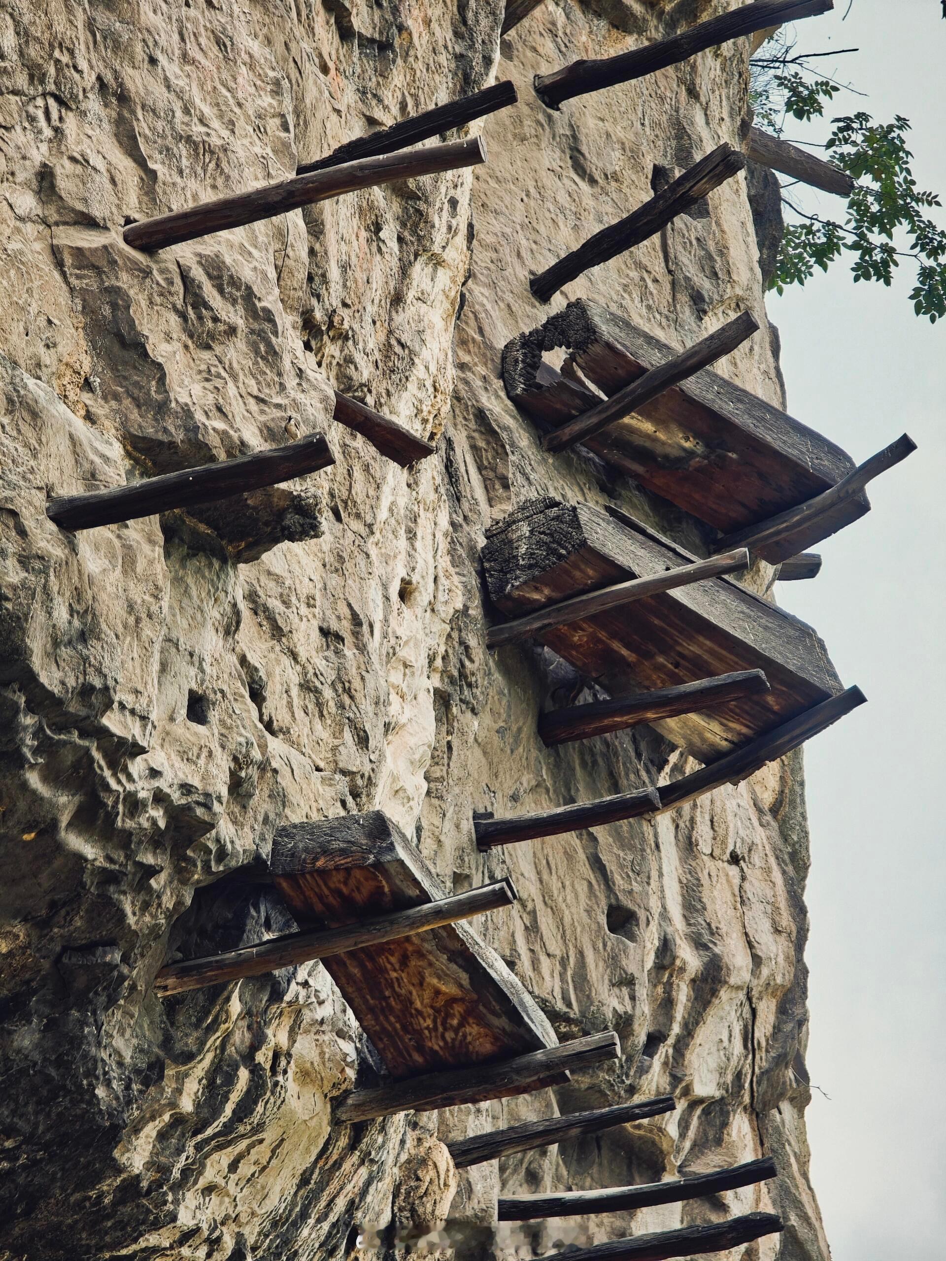 僰人攀岩在行,悬棺密密麻麻置于峭壁之上,怎么上去的?老专家有几种观点。有人说是河流涨水后,僰人乘船浮到高处放棺,水落乃成;有人说是僰人代代都有轻功高手,运口真气飞上去的;有人说是先修栈道,抬棺上去后,再把栈道拆了;有人说是从崖顶垂绳索放下去的……