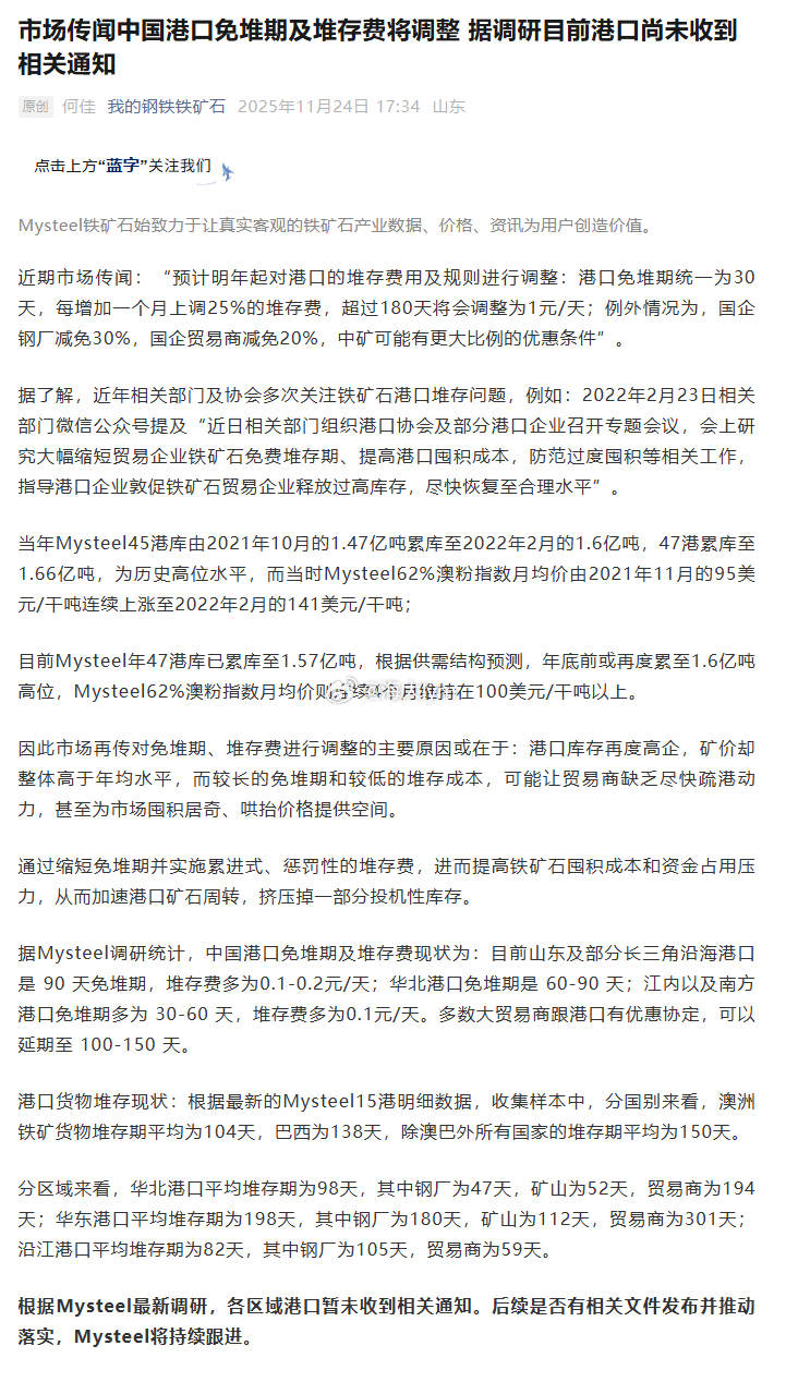 市场传闻中国港口免堆期及堆存费将调整 据调研目前港口尚未收到相关通知(Mysteel)