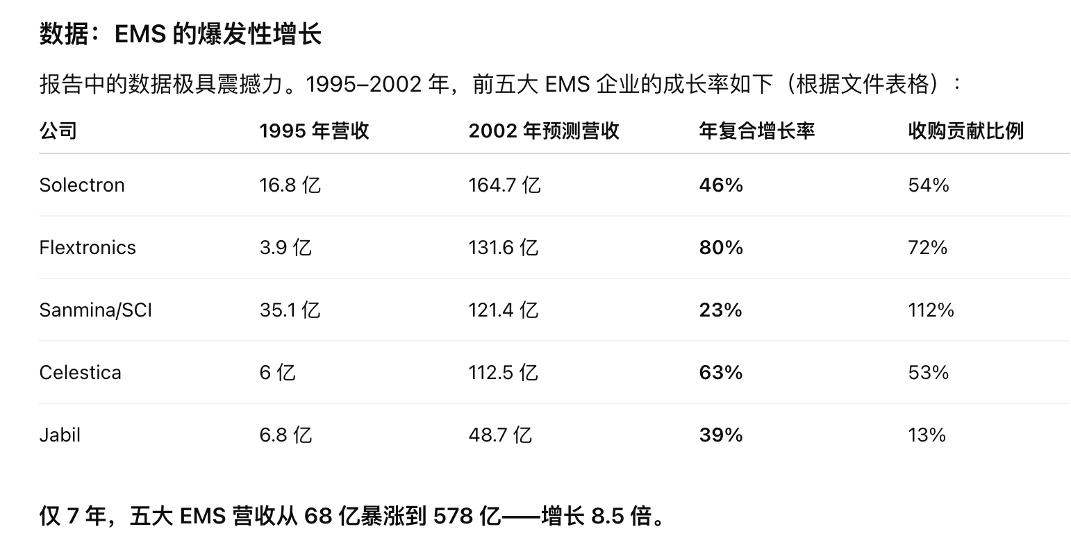 这个世界的制造体系是怎么形成的,往往取决于一些大型企业的战略选择。1996 年 4 月,苹果宣布将其位于美国科罗拉多州 Fountain 的最大电脑制造厂出售给 SCI Systems——当时全球最大的专业电子制造服务商(Contract Manufacturer)。戏剧的是:苹果卖掉工厂,不是因为需求不足,而是因为需求太高而跟不上生产。苹果当时遇到的问题是典型的“预测错配”:消费者疯狂抢购高端机型,而苹果错误地押注低端产品,库存不断累积,热门机型却缺货。1995 年 PC 行业增长达 25%,关键零件如内存芯片短缺,苹果无法及时调整产能。出售工厂后,苹果并未停产,而是让 SCI 接手制造。这意味着:苹果从“固定成本模式”转为“可变成本模式”供应链弹性大幅提升可以通过外部产能应对需求激增,而无需新增内部工厂苹果的目的是借用 SCI 规模化制造的优势。制造规模不再由品牌厂商掌握,而由外部的大型专业化供应商掌握。这种变化不仅发生在苹果,还发生在整个美国电子行业。从 1980s 后期开始,北美大型电子企业,例如IBM、HP、Nortel、Lucent、3Com、Maxtor、Sun Microsystems、Silicon Graphics、Cisco Systems、Network Appliance纷纷出售工厂与制造资产给专业 EMS 厂。这些公司越来越专注于产品定义、架构设计、市场开发、品牌经营。而把制造端交给 Solectron、Flextronics、SCI、Celestica、Jabil Circuit 等 EMS 龙头。