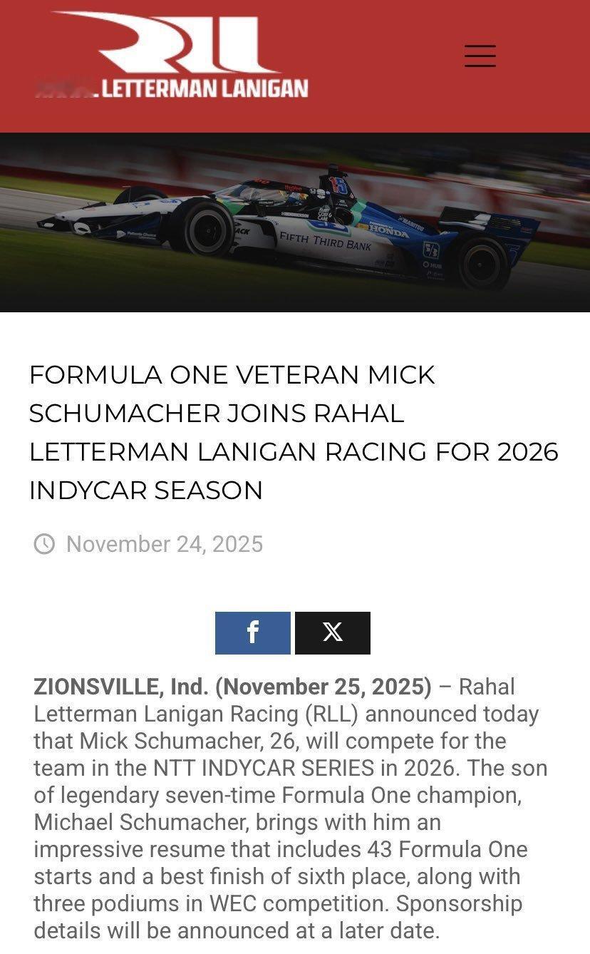 米克-舒马赫2026赛季加盟Rahal Letterman Lanigan Racing,参加全赛季Indycar赛事