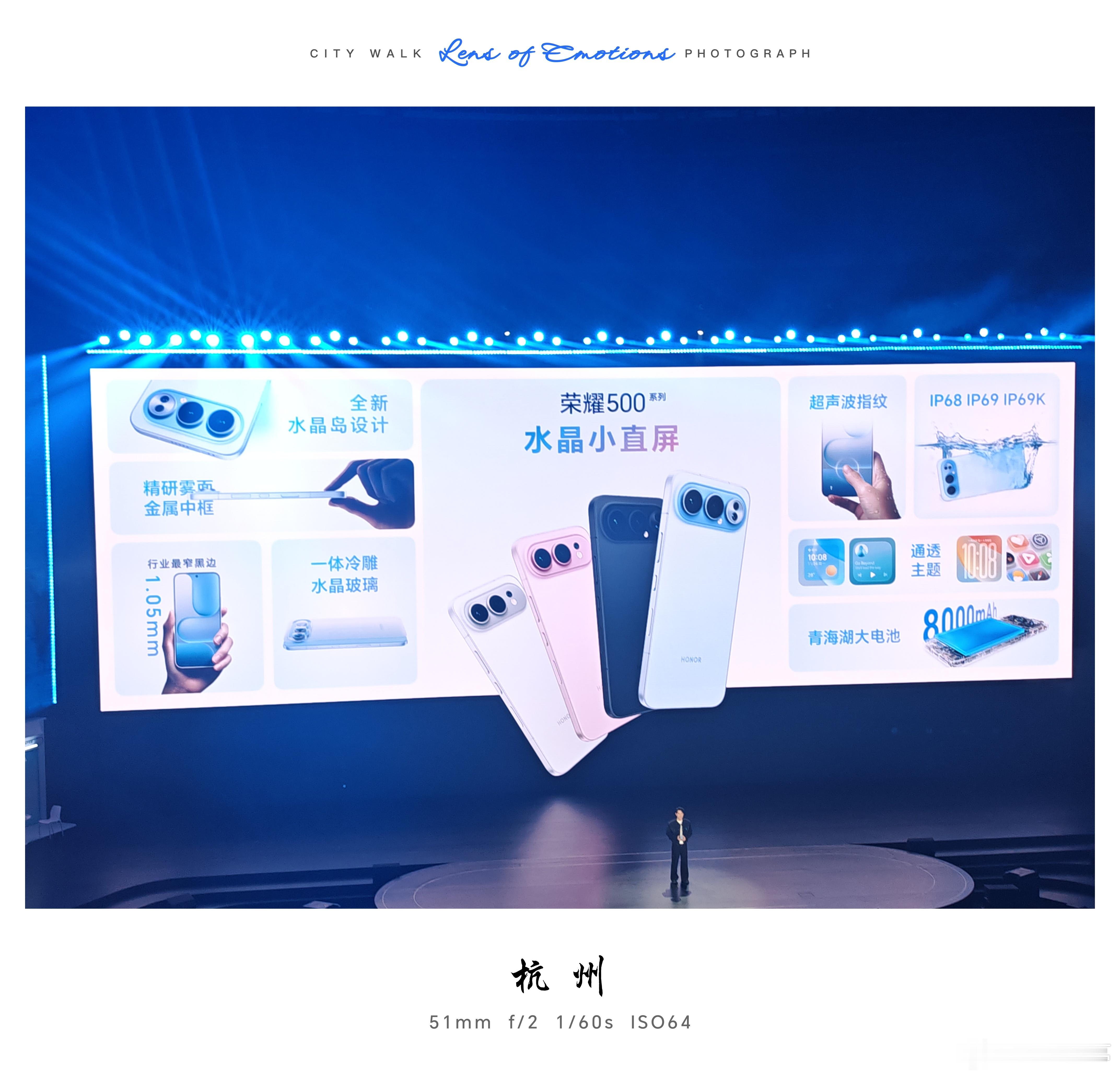 系列全新外观设计,打造超美水晶小直屏! 荣耀500系列推出海蓝宝、星光粉、月光银、曜石黑四款“好运水晶配色”,背板采用一体冷雕工艺,历经40多道工序,在玻璃上实现了的96%超高透光率,带来通透高级的背板美学。手机在仅7.75mm的轻薄机身中,巧妙容纳8000mAh大电池,正面边框行业最窄1.05mm确实漂亮。
