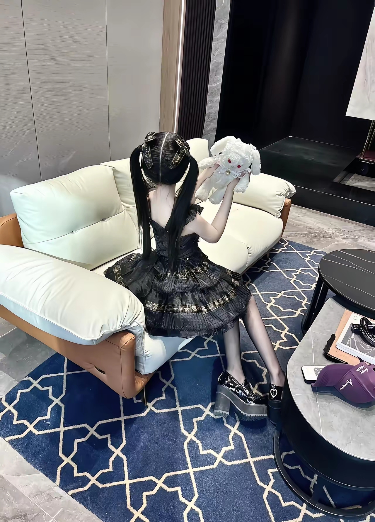黑裙裹身,青龙盘踞腰肩,黑丝配高跟,蕾丝吊带袜勾勒隐秘风情。