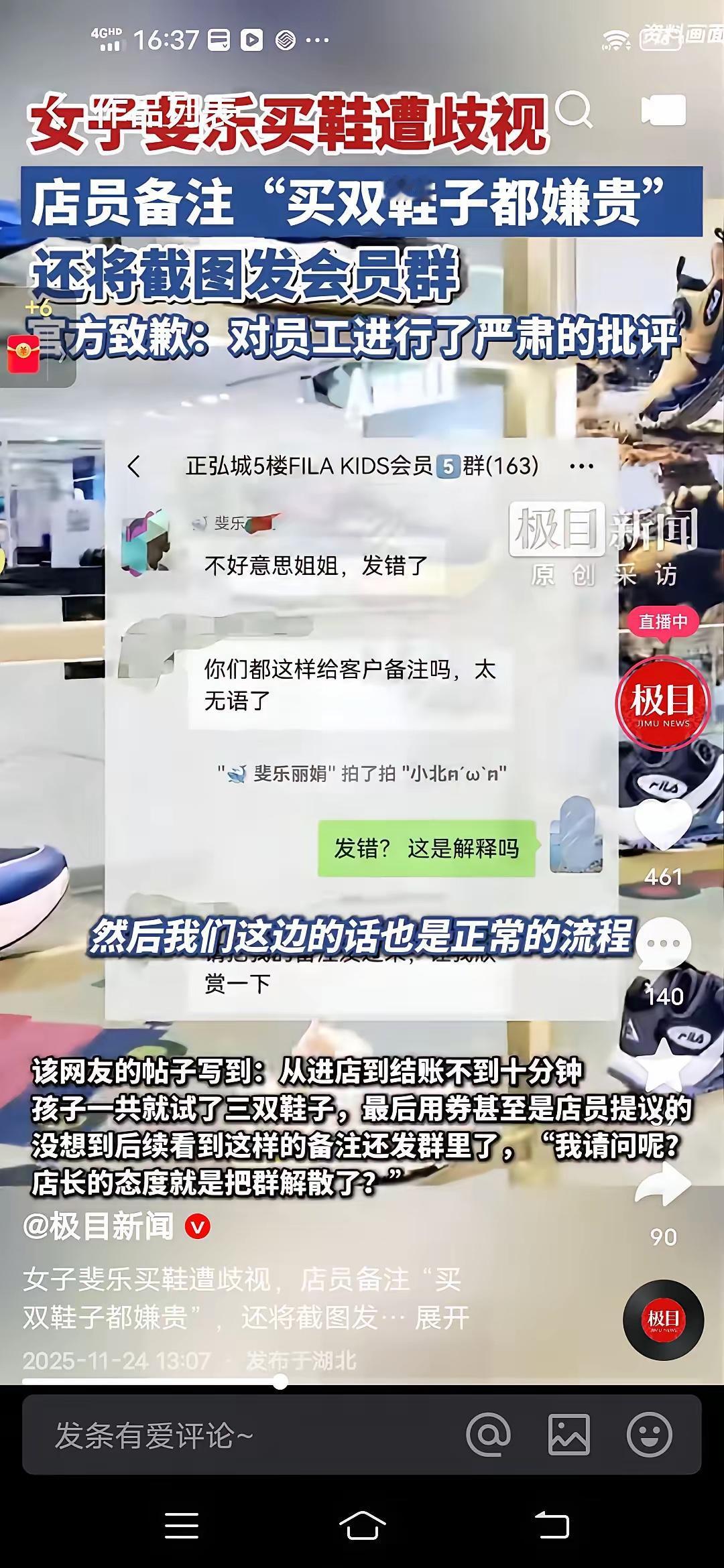 最近看新闻了吗?一女子带孩子去斐乐服装店买鞋子,从入门到结账一共试了三次鞋,用了10分钟,本来交易到此就结束了,可是没想到,服务员把交易截图发到了会员群里,女子看到后,一下子炸了锅。 这事儿说起来,好多人可能都有类似的感受。去店里买东西,试穿几下不是很正常吗?10分钟试三双鞋,真不算耽误事儿,毕竟买鞋得合脚,尤其还是给孩子挑,多试两次才能放心。谁也没料到,服务员转头就把交易截图扔到会员群里,这操作确实让人摸不着头脑。 后来才知道,截图里不光有消费信息,还带了句“试了半天就买双最便宜的”。你说这叫什么事儿?顾客花多少钱买东西,那是人家的自由,试穿也是消费过程的一部分,凭啥被背后议论还发到群里?这不仅是不尊重人,更涉嫌泄露顾客的消费记录了。 换作谁遇到这种情况,估计都得气够呛。买东西图的是舒心,结果被人当谈资,还被贴标签,换谁能忍?而且会员群里那么多人,消息一传,谁知道会不会有人跟着瞎起哄?这对顾客的心理影响可不小。 说起来,现在实体店生意不好做,大家都理解服务员可能有业绩压力,但压力再大也不能这么干啊。服务业讲究的是尊重和信任,顾客愿意进店消费,本身就是一种认可,哪怕买的东西便宜,也是对门店的支持。背后搞这种小动作,看似发泄了情绪,其实伤的是门店的口碑。 我觉得这事儿根子上还是服务意识的问题。服务员可能觉得就发个群没多大事,但没意识到这侵犯了顾客的隐私,也伤了和气。店家要是真想提升业绩,不如多琢磨怎么优化服务,让顾客试得开心、买得放心,而不是靠这种让人不舒服的方式吐槽顾客。 各位读者你们怎么看?欢迎在评论区讨论。