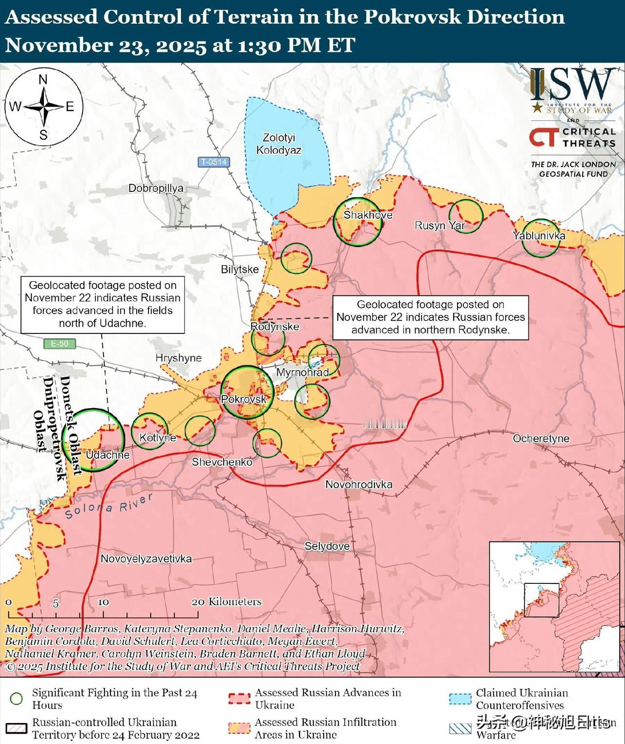 波克罗夫斯克方向的局势依然严峻且瞬息万变,俄军持续推进以缩小波克罗夫斯克-米尔诺赫拉德包围圈,而乌克兰军队则继续反击。俄军正从包围圈北侧推进,力图完成对波克罗夫斯克-米尔诺赫拉德的包围。11月22日发布的地理定位视频显示,俄军近期在罗丁斯克北部(波克罗夫斯克以北)取得了进展。11月22日发布的另一段地理定位视频显示,乌克兰军队在波克罗夫斯克北部对俄军发动了攻击。据ISW评估,此次俄军渗透行动并未改变地形控制或战区前沿(FEBA)的走向。11月23日一位与克里姆林宫有关联的俄罗斯军事博客作者声称,俄军正在完成波克罗夫斯克的清剿行动。这位军事博主声称,俄军在波克罗夫斯克和切尔沃尼(克拉斯尼)莱曼(米尔诺赫拉德以北)之间设立了一个“杀伤区”(紧邻前线,大量战术打击和侦察无人机在该区域盘旋,对任何进入该区域的装备或人员构成极高风险)。该博主还声称,俄军在米尔诺赫拉德的袭击正在增加,无人机操作员正在进入该镇。此外该博主还声称,波克罗夫斯克-米尔诺赫拉德地区的其余部分很可能是一个存在争议的“灰色地带”。 乌克兰军队继续反击,并在波克罗夫斯克市内及周边地区保持有限的兵力部署。乌克兰空降突击部队第7快速反应军于11月23日报告称,波克罗夫斯克市中心战斗仍在继续,乌克兰军队阻止俄军集结足够兵力推进至该市北部。第7军指出,俄军试图经由顿涅茨克铁路向波克罗夫斯克北部推进,但损失惨重。一位俄罗斯军事博主也在11月23日证实,乌克兰军队在科扎茨克(米尔诺赫拉德以东)和普罗明(科扎茨克以南)之间保持着零星兵力部署。俄罗斯军事博主还声称,乌克兰军队正在波克罗夫斯克北部和格里申附近(波克罗夫斯克西北部)进行反击。 乌克兰军队还对支持波克罗夫斯克行动的俄军后勤补给线实施了战术级别的空中封锁行动。乌克兰特种作战部队(SSO)于11月23日报告称,乌克兰军队对参与波克罗夫斯克方向进攻的俄军进行了无人机打击。SSO报告称,乌克兰军队袭击了位于波克罗夫斯克一处工业设施高地上的俄军阵地,俄军狙击手曾利用该阵地对周边地区进行火力控制。SSO报告称,俄军还在该地区集结兵力。SSO报告称,乌克兰军队还袭击了位于沙霍韦(波克罗夫斯克东北部,多布罗皮利亚以东)的俄军第336海军陆战旅(波罗的海舰队)的集结地,该旅正试图从北部包围波克罗夫斯克。乌克兰国家安全办公室(SSO)报告称,乌克兰军队还袭击了俄军第6坦克团(隶属中央军区第41集团军第90坦克师)的一个集结地和无人机弹药库,该地位于被占领的松齐夫卡(位于俄军战术后方,波克罗夫斯克以南27公里处)。SSO还报告称,乌克兰军队袭击了位于被占领的杜库恰耶夫斯克(位于俄军战线后方,波克罗夫斯克东南71公里处)的另一个弹药库,俄军曾利用该弹药库储存、分发和运输装备,以支援向波克罗夫斯克方向进攻的部队。 ISW 继续评估认为,俄军极有可能完成对波克罗夫斯克和米尔诺赫拉德的占领,但占领的具体时间和作战影响目前尚不明确。俄罗斯很可能会利用最终占领波克罗夫斯克来制造舆论,以推进克里姆林宫关于俄军在战场上必胜的虚假叙事。然而俄军在战场上并非必胜,值得注意的是,俄军用了 21 个月的时间才推进约 40 公里,开始包围波克罗夫斯克-米尔诺赫拉德地区。夺取顿涅茨克州剩余部分,包括乌克兰面积更大、人口更稠密的“要塞带”,则需要数年的战斗,而自 2022 年以来,俄军并未展现出迅速包围、渗透或以其他方式占领“要塞带”内城市的能力。
