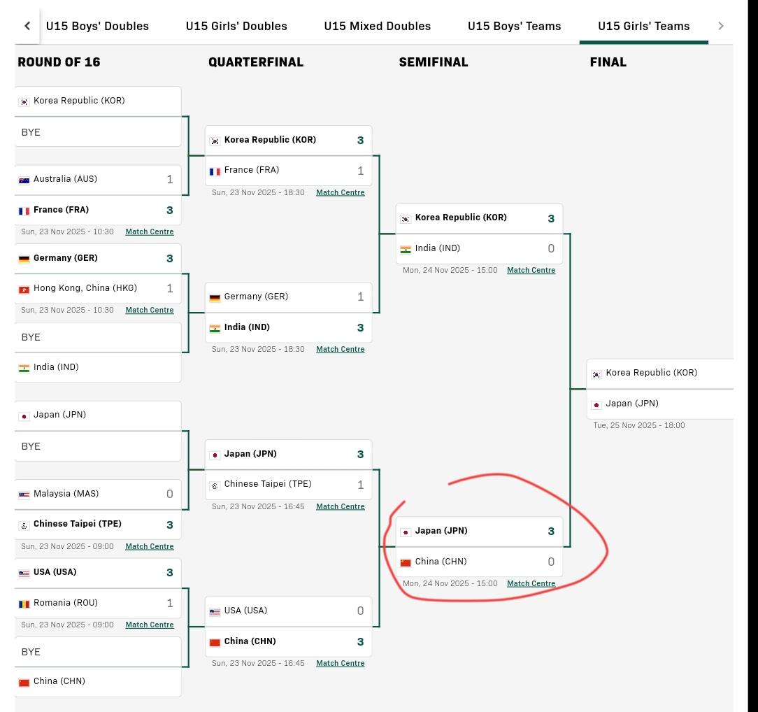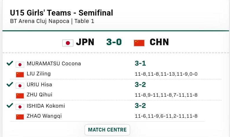 U15女团,国少队0:3被日乒淘汰,止步半决赛。 刘子菱、祝启慧、赵王琪三人出战,未赢一盘败下阵来。 这是今天继u19男团出局后,又一败绩。