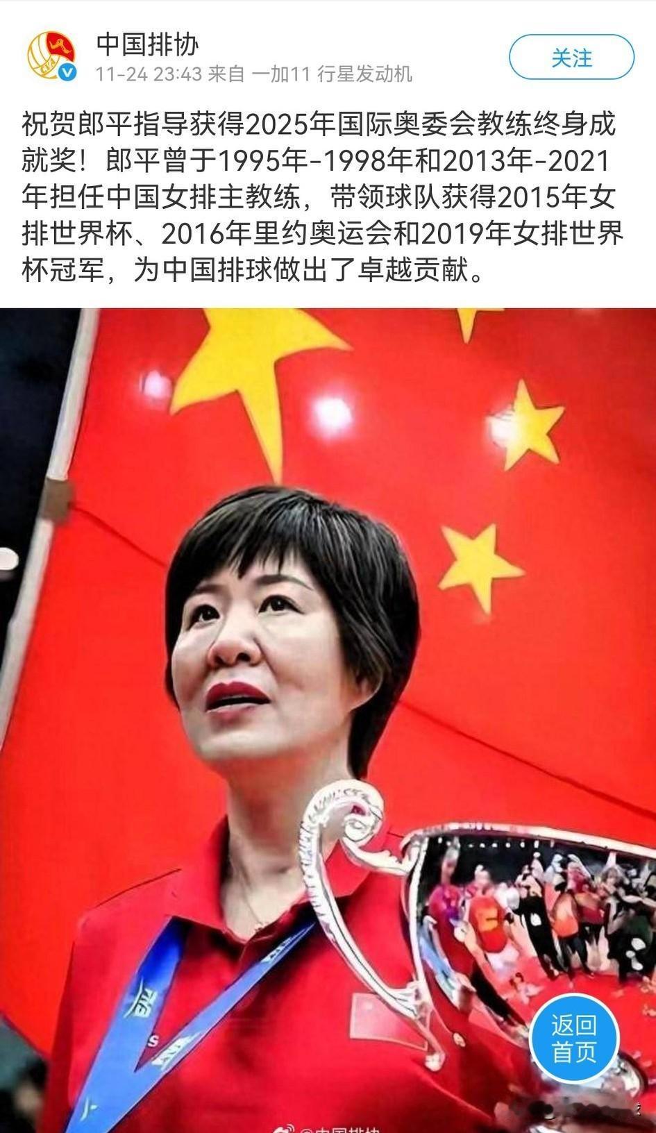 实至名归!郎平荣获2025年国际奥委会终身成就奖! 奇怪的是:还是某协官微发布,评述了郎平两次执教中国女排所带来的荣耀。以前某协恨不得与郎平完全撕裂开,没有这个人,除了张然的那篇批斗大字报依然高挂。 这是破冰的节奏,还是啥意思?不太明白! 而世锦赛至今为止,没有一人站出来主动承担责任。让球迷失望到极点! 准确说内耗毁了中国女排,球迷眼看着一支球队由盛到衰,即便跟着着急也使不出劲来。 世锦赛中法之战后,其中一些正直的球迷为中国女排出谋划,恨不得自己上场打比赛。 当然也包括我提了好几点:比如副攻助教请一位巴西的教练,还有送更多的优秀球员去意甲土超。 不得不说某协在整改:庄宇珊当打之年被送出去了,李盈莹去了米兰能够让自己的踝伤更好的疗养! 最后还是希望中国女排越来越好,明年亚锦赛直通洛杉矶奥运会!