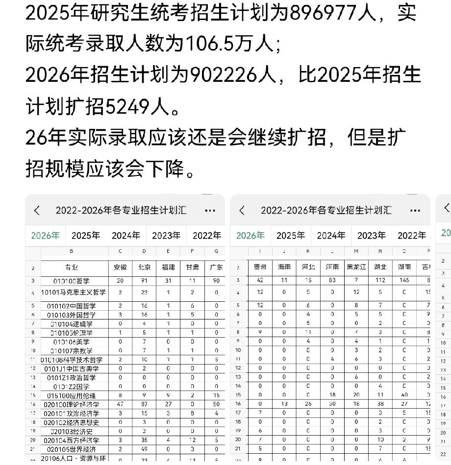 马上又要研究生考试了。考研,其实是高考之后的一次又一次“烧烤”中比较容易的,比起考公考编……自己体会。 今年研考报名人数继续“降低”,比去年少了45万,而招生人数继续扩大,多了5000人。 那么是不是这两年考研越来越容易了呢?不是。报名人数—实际考试人数—全力以赴准备考试的人数,不是一回事。前两年报名四百万+的时候,又五六十万弃考,每年实际参考人数就是三百多万人。 十取三,努力吧!