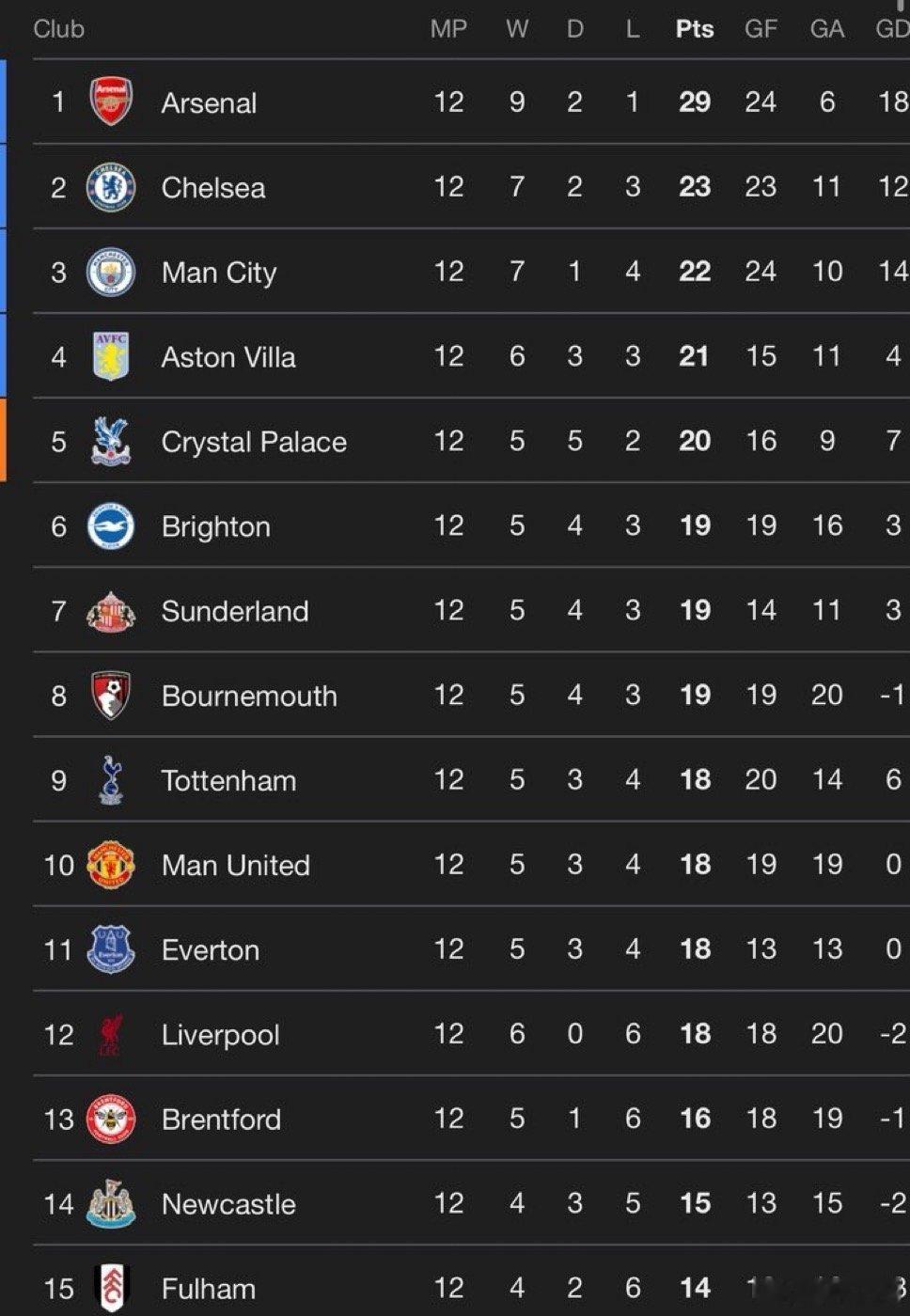 同样12轮过后 英超的积分榜如下 切尔西上升到了第2位曼联第10 利物浦第12