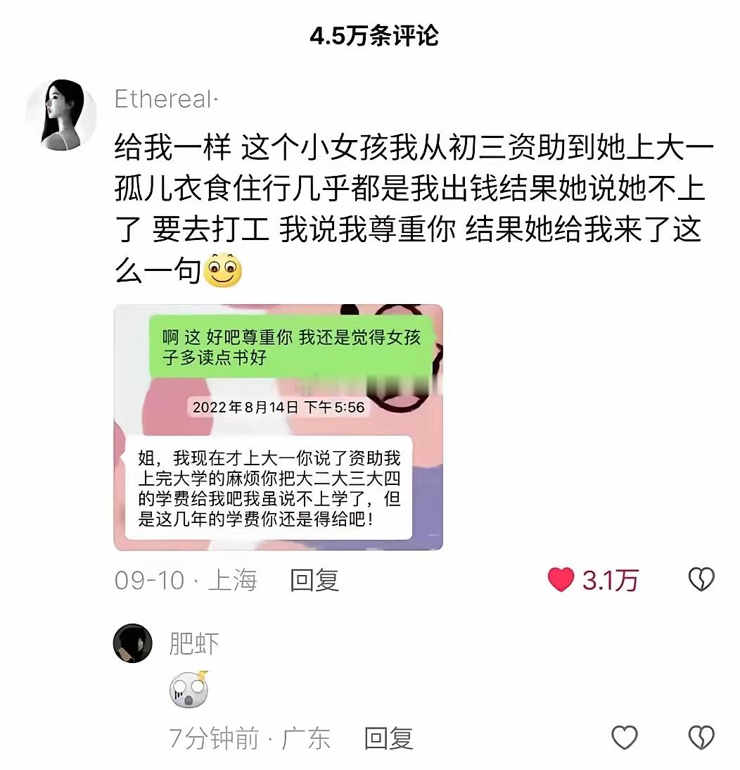 爱谁谁 77 2025-11-25 15:45 我也资助过一些学生,但我从不连续性资助,同一个人资助最多不超过三次,就是怕遇到升米恩斗米仇的事,我只是资助你不是养你,养你是国家的事,因为我不需要报答,所以你记不记得我也无所谓,只是让自己的心灵平静而已。 12588 回复 11-26 09:18 本来就应该国家的事,人人有书读有工作。全推给心地善良的人 哦豁 回复 11-26 08:09 孤儿不是该国家养?