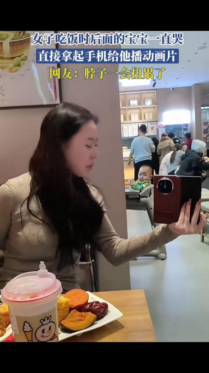 女子吃饭时后面的宝宝一直哭,直接拿起手机给他播动画片。网友:脖子一会扭累了。 11月24日山西。