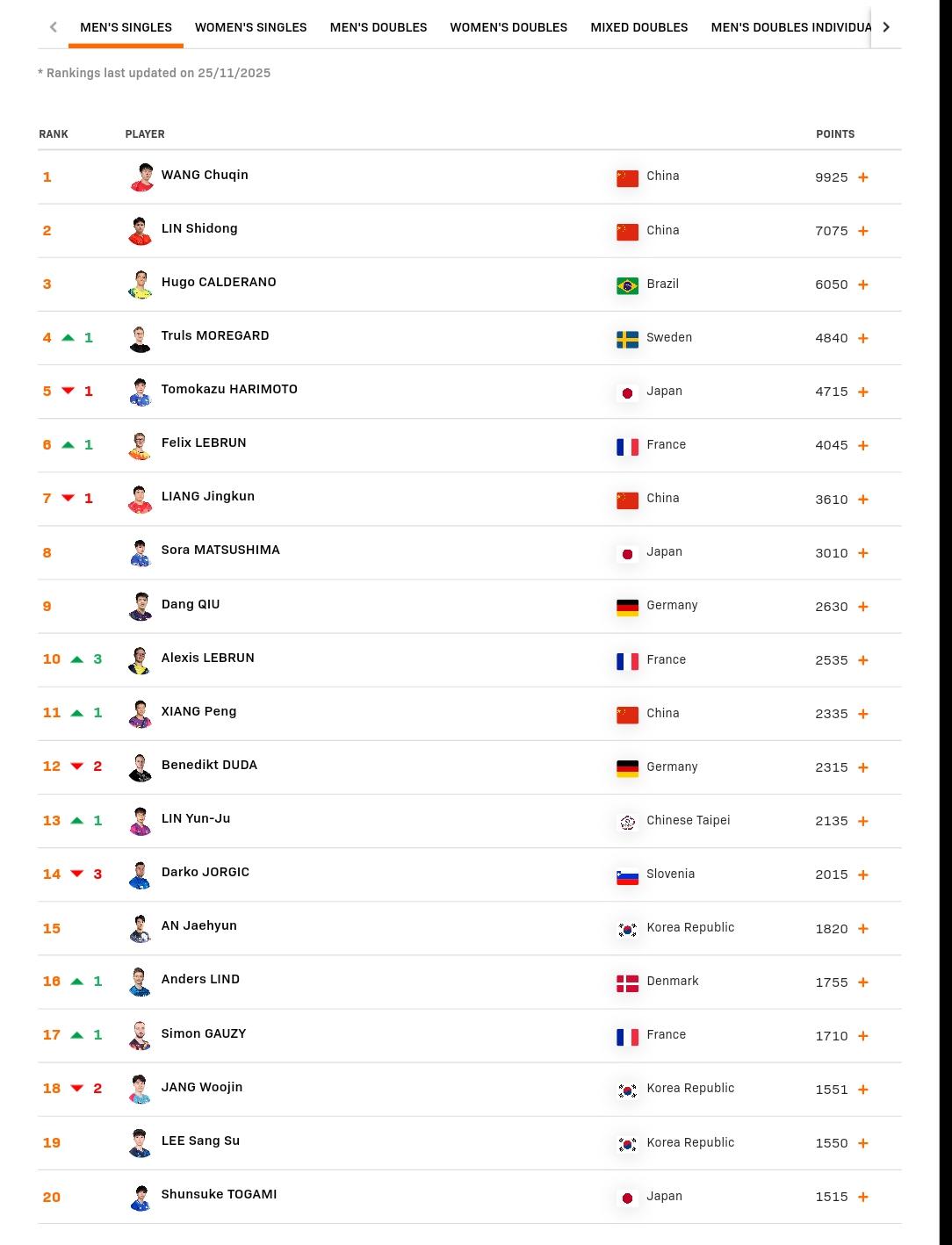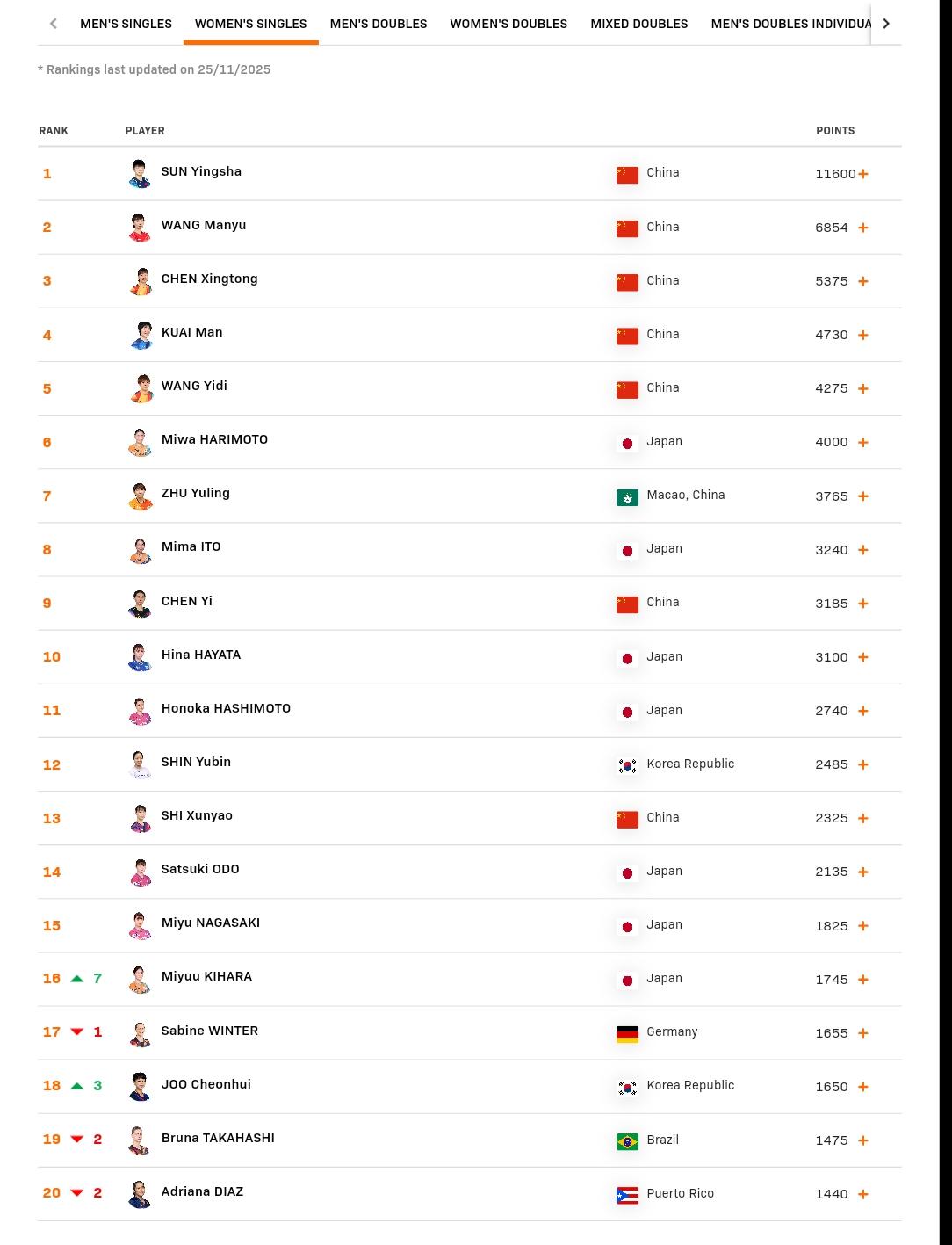 新出炉的世界排名。 男单前20,亚洲占11位,欧洲8位,美洲1位,大格局是亚欧对抗。 女单前20,亚洲占了17位,欧洲1位,美洲2位。 东亚遥遥领先,欧美整体缺乏竞争力。