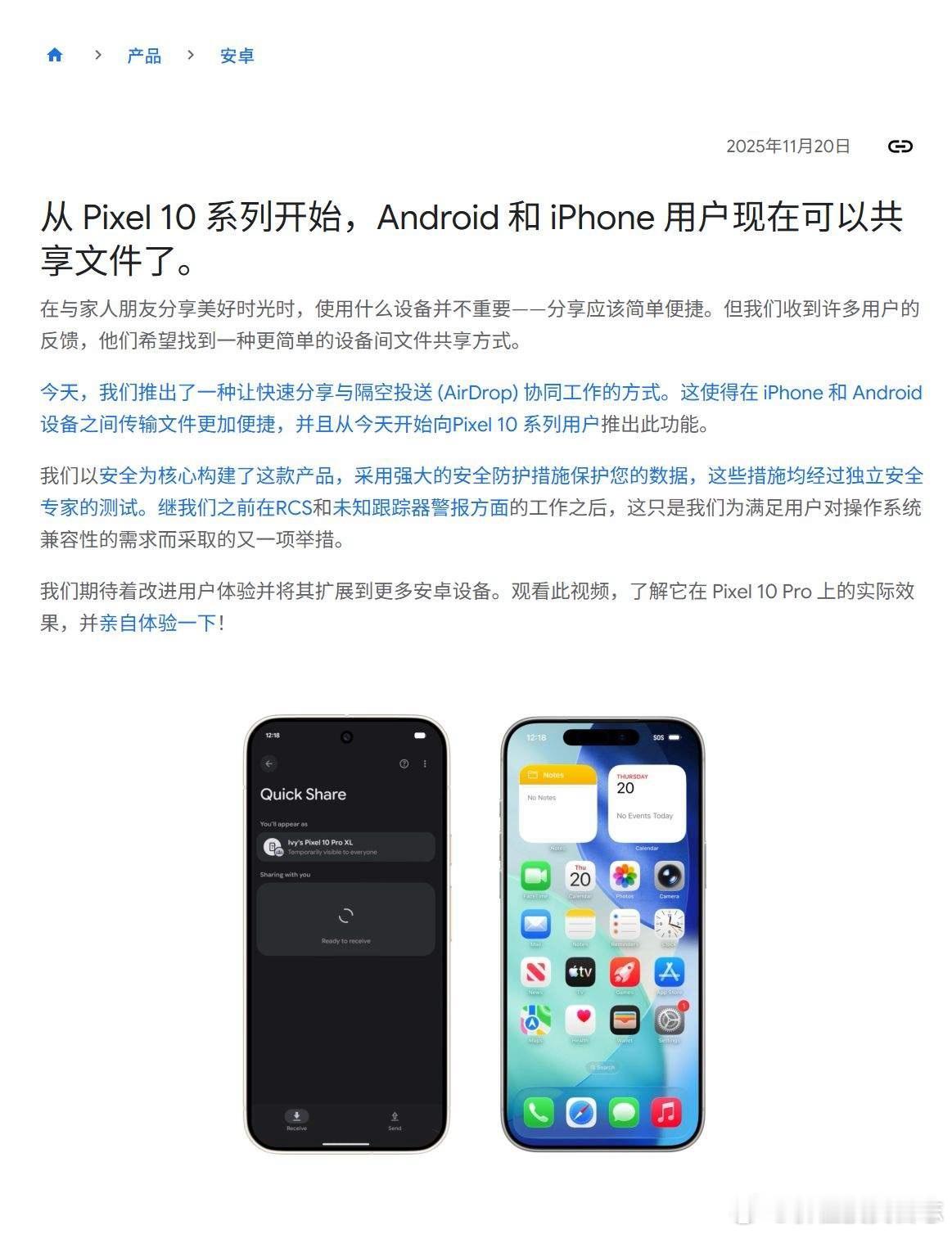 谷歌和苹果官宣:安卓“快速分享”和苹果“隔空投送”实现跨平台互通!现在iPhone/iPad/Mac能直接给Pixel 10系列传文件,操作和收苹果设备的AirDrop完全一样——只要把可见性设为“对所有人开放10分钟”,确认设备名+接收方同意就能传,还是点对点直连、不经过服务器,安全感拉满。这波属于是“老大老二不打架,联手把路修平了”,终于不用再对着微信100M文件限额骂骂咧咧,也不用折腾第三方APP了!