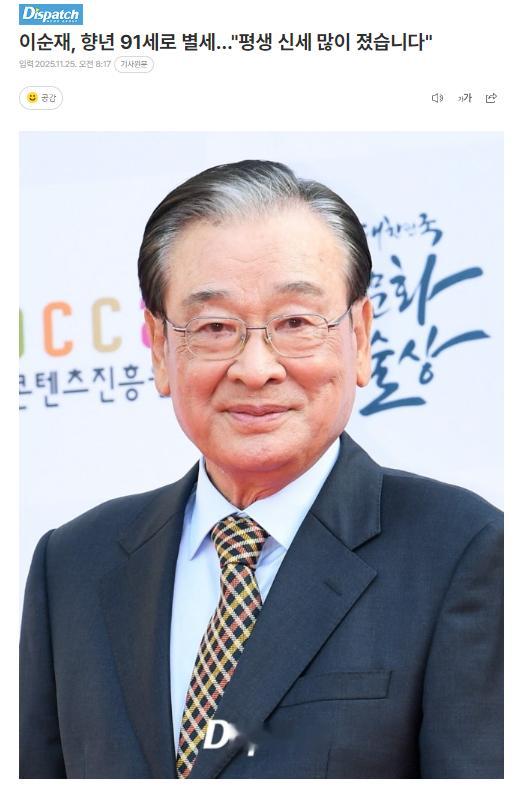 元老级演员李顺载今日辞世,享年91岁 据遗属透露,元老级演员李顺载于25日凌晨辞世,享年91岁。他于1956年通过话剧《越过地平线》出道,之后通过出演KBS-TV电视剧《我要成人》走上了近70年的演员道路。