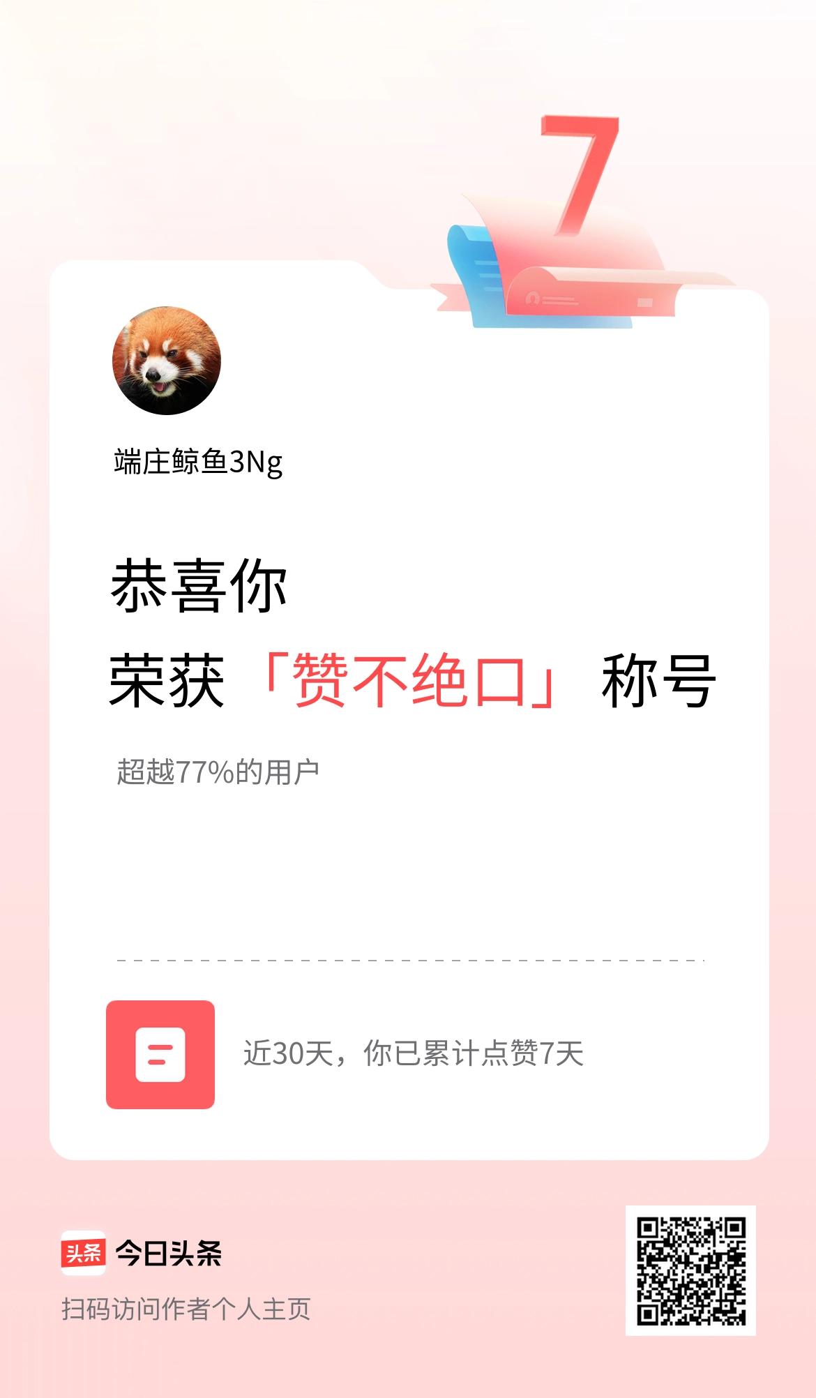我在头条30天内点赞打卡7天,获得“赞不绝口”称号