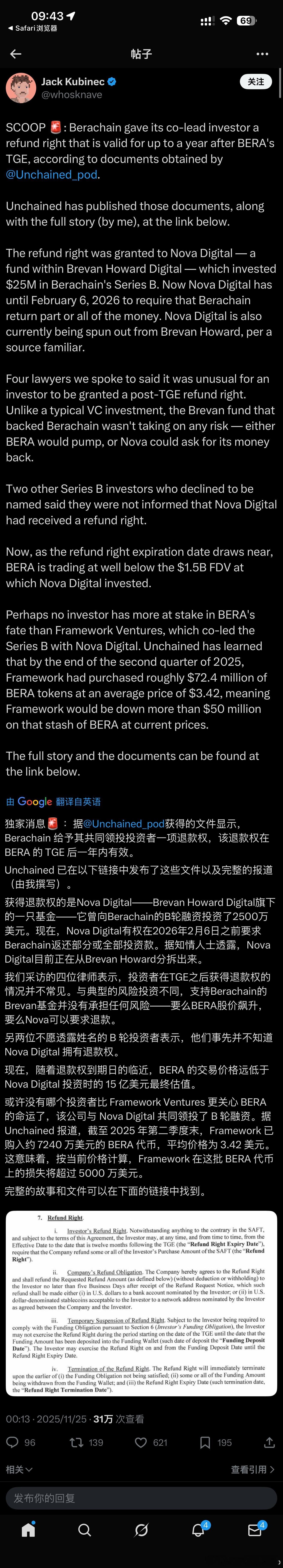 Berachain被爆给领投方Nova Fund私下塞了一年退款权:B轮15亿估值投2500万美金,现在币值只剩5.5亿,它可以直接原价退款跑路。其他同轮机构完全不知情,傻乎乎真金白银陪跑。现在全网都在盯着Monad:你拿了这么多钱不会也是用的这招吧