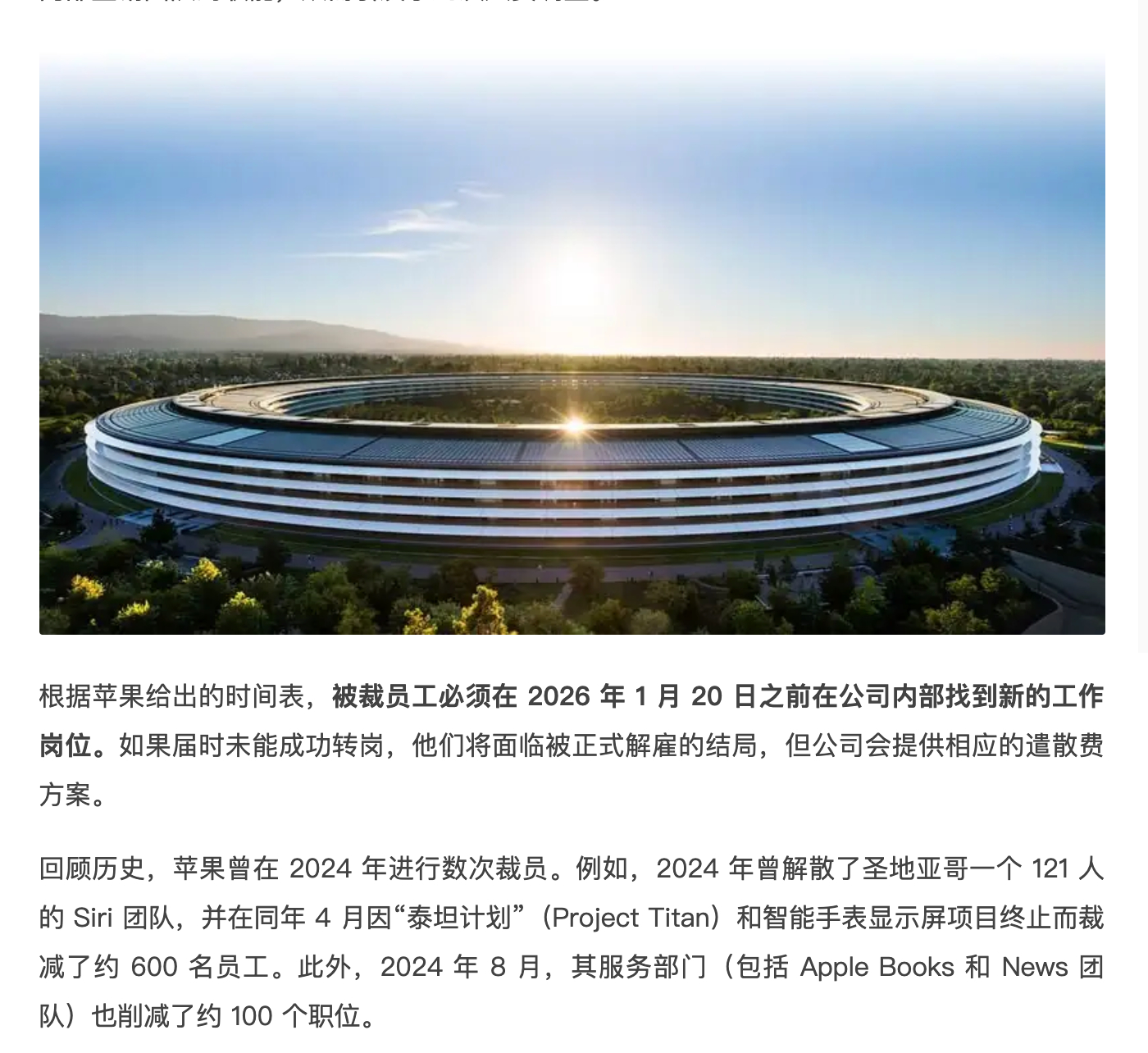公司十几万人,裁员数十名,算小范围调整。而且被裁员工如果能在2026年1 月20日之前,在公司内部转岗成功,也不会被解雇。