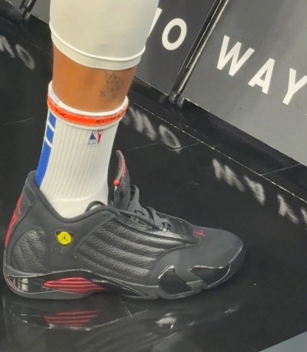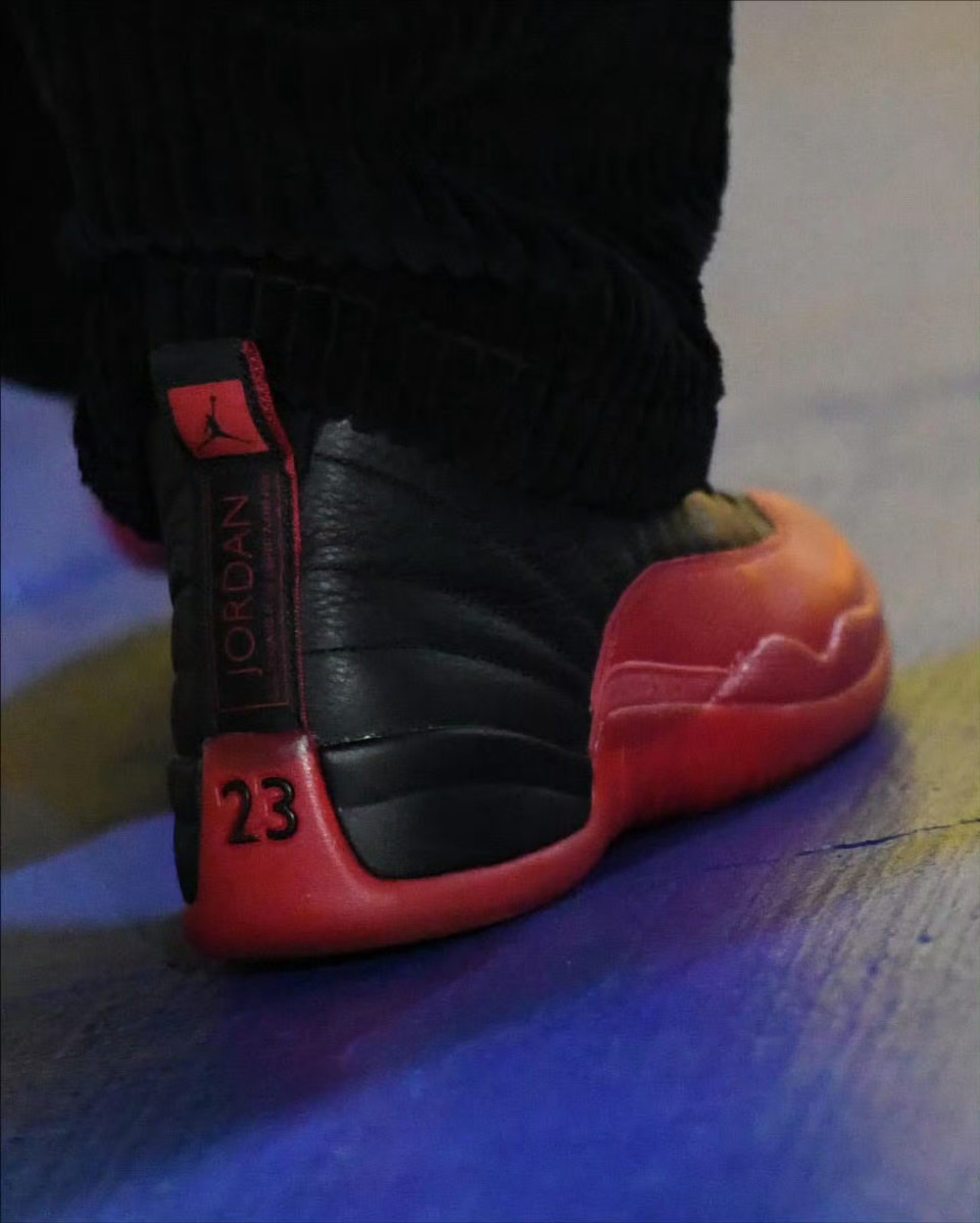 继续致敬传奇赛前入场,库里上脚Air Jordan 12“流感之战”。(图1、图2)在赛前热身训练中又上脚Air Jordan XIV(14)“Last Shot”。