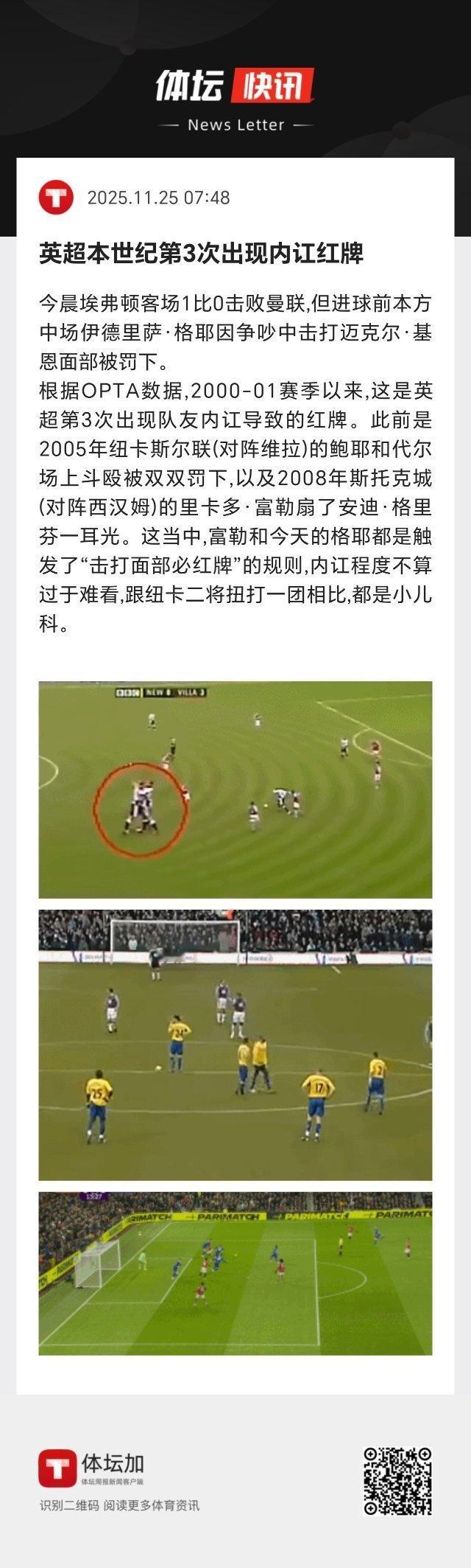 2000-01赛季以来,这是英超第3次出现队友内讧导致的红牌。