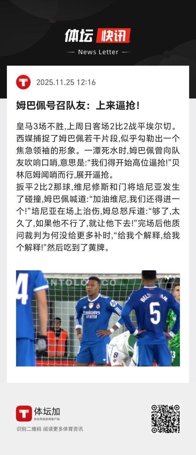 姆巴佩曾向队友吹响口哨,意思是:“我们得开始高位逼抢!”贝林厄姆闻哨而行,展开逼