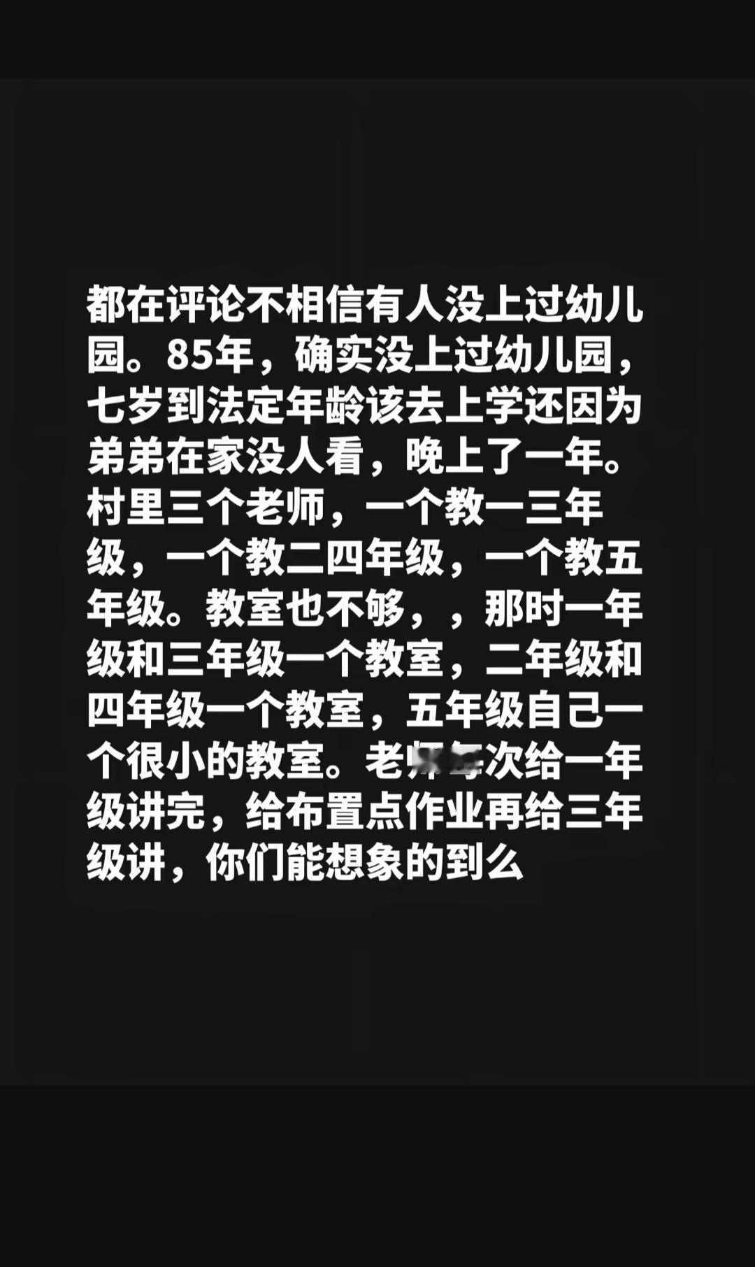 80后的我,没有上过幼儿园,跟着学前班的哥哥每天上学玩,估摸有半年吧,经常趴在窗户外跟着老师朗读,哥哥下课了就和他们玩沙子,有时候他们在教室写作业,没有朗读的时候,我就一个人在操场的沙坑里写数字或拼音。从小好像就比较爱想学习,会数十六了,就回家写了个106,问妈妈这是十六吗?妈妈说分个位,十位,百位,我写的是一百零六,十六是16这样写的,她说了一遍我就懂了。我天天泡在学校,冬天天冷,老师就让我进了教室坐我哥哥旁边,但没有交学费也没有自己座位,期末考试老师多沓印了一份语文和数学试卷给我做做看,我语文得了96,数学100分,就这样跟着哥哥一起读了一年级!
