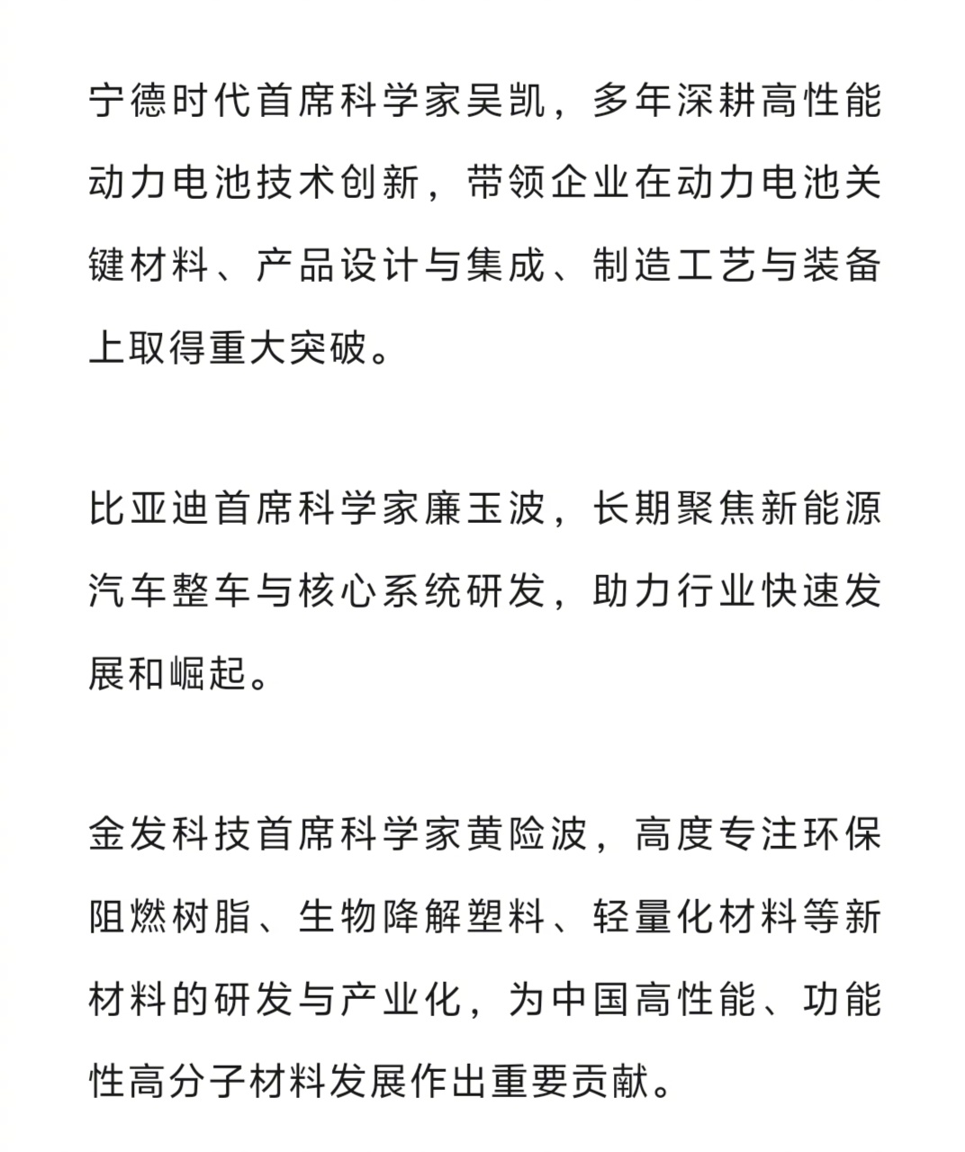今年,有3位来自民营企业的专家当选为院士,这是非常好的征兆。他们分别是:宁德时代首席科学家吴凯比亚迪首席科学家廉玉波金发科技首席科学家黄险波