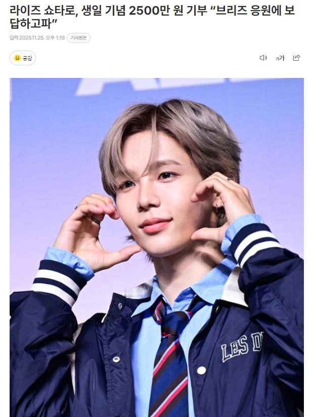 SHOTARO在生日之际以BRIIZE名义捐款2500万韩元联合国儿童基金会韩国委员会方面表示,RIIZE成员SHOTARO在11月25日生日之际以粉丝BRIIZE的名义捐款2500万韩元。他的温暖心意将用于优先用于联合国儿童基金会的核心项目,包括医疗保健、营养、饮用水与卫生设施、教育援助、保护行动以及紧急救助等,用于全球范围内最急需支援的地区和业务板块。