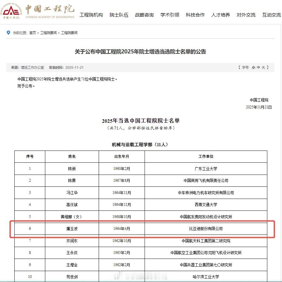 这次当选院士,也再次证明比亚迪的核心不是营销,而是技术。中国工程院公布最新的院士增选结果,比亚迪迎来了一个重量级好消息,集团首席科学家、汽车总工程师、汽车工程研究院院长廉玉波,当选为中国工程院院士,以技立身荣膺院士。这不仅是他个人的荣誉,背后代表的更是是中国新能源汽车技术的全面崛起。