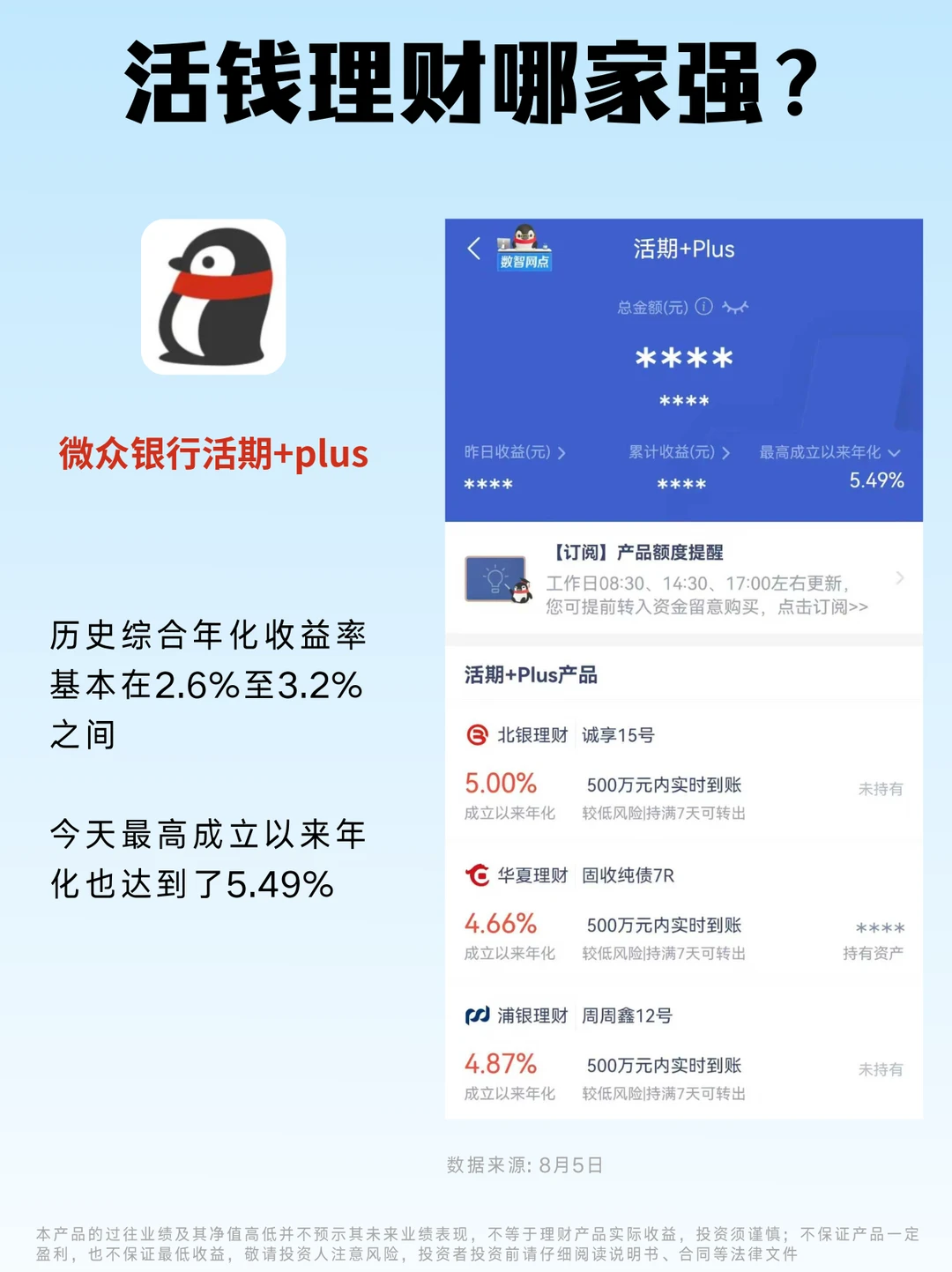 但其实活钱理财玩好了也能小赚一笔的!活钱理财产品很多,但收益情况一年下来能差不少。这很多时候就是信息差问题,稍微搜一搜就能知道。像是我最近关注到的微众银行活期+plus,历史综合年化收益率基本在2.6%-3.2%之间,今天最高成立以来年化也达到了5.49%(数据来源:8月5日),真的挺香的,这个产品和我的筛选标准也比较契合(放图三了)。
