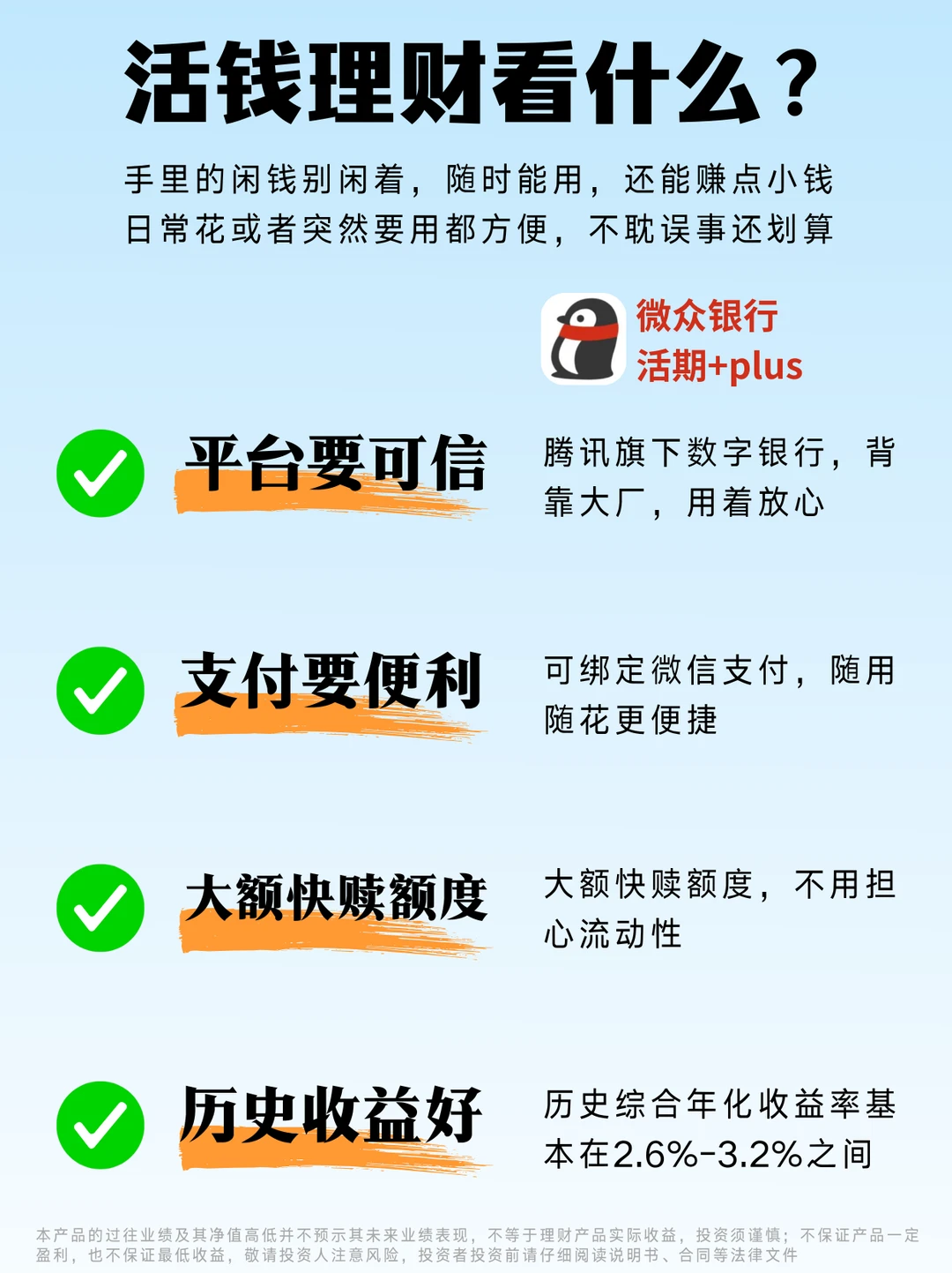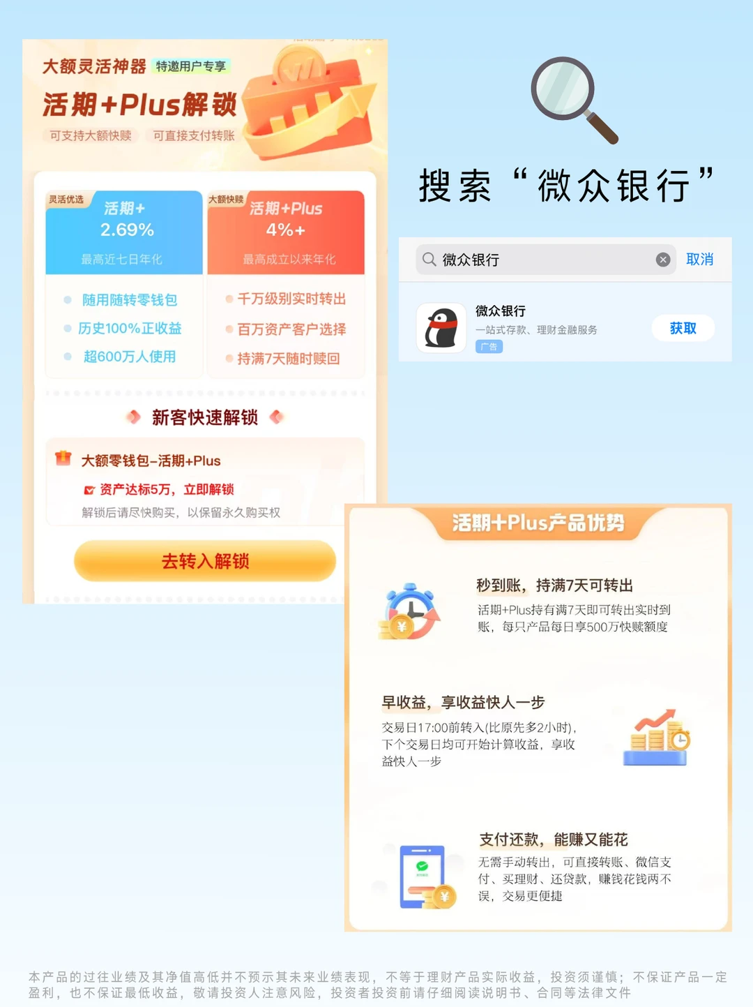 现在想要解锁活期+Plus,只要在微众银行转入5万资产就可以了,门槛也不高,有兴趣的朋友可以看看的!现在市场环境不确定性很高,稳健的赚钱方式多看多对比!