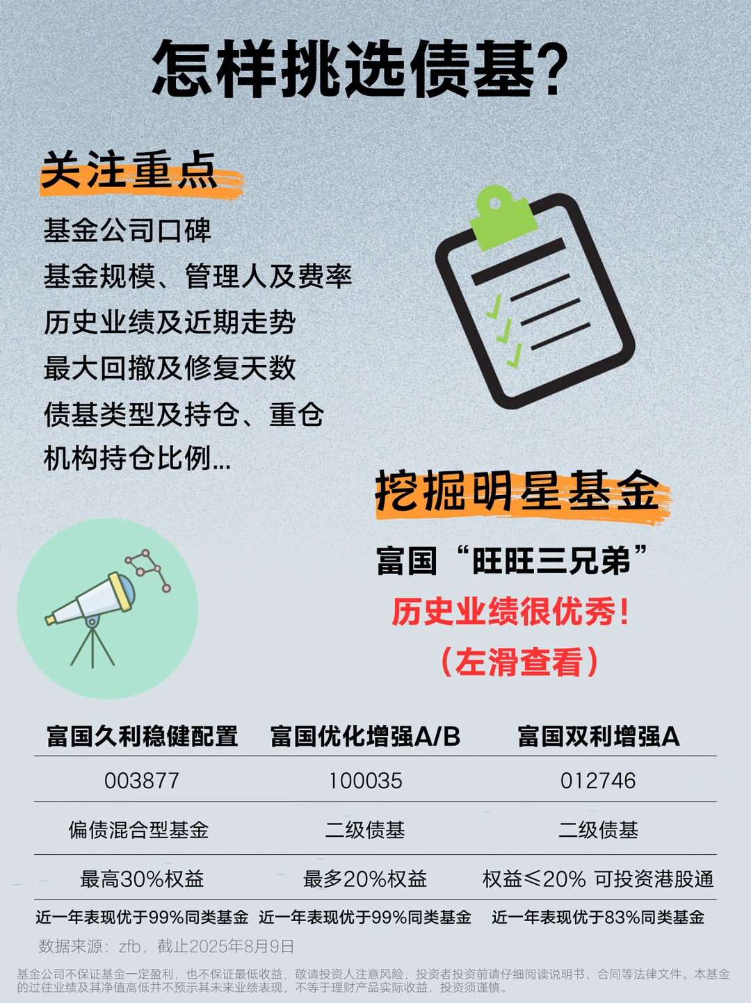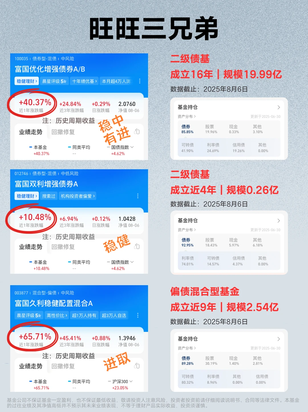 这背后的关键在于权益增强。除了配置一定的股票外,还会配置可转债,相当于买入债券+一个看涨期权,持有期间能拿到债券的固定利息,有个稳稳的安全垫,看涨期权意味着如果股价上涨,可转债也能跟着水涨船高。富国基金的“旺旺三兄弟”就是很好的例子!