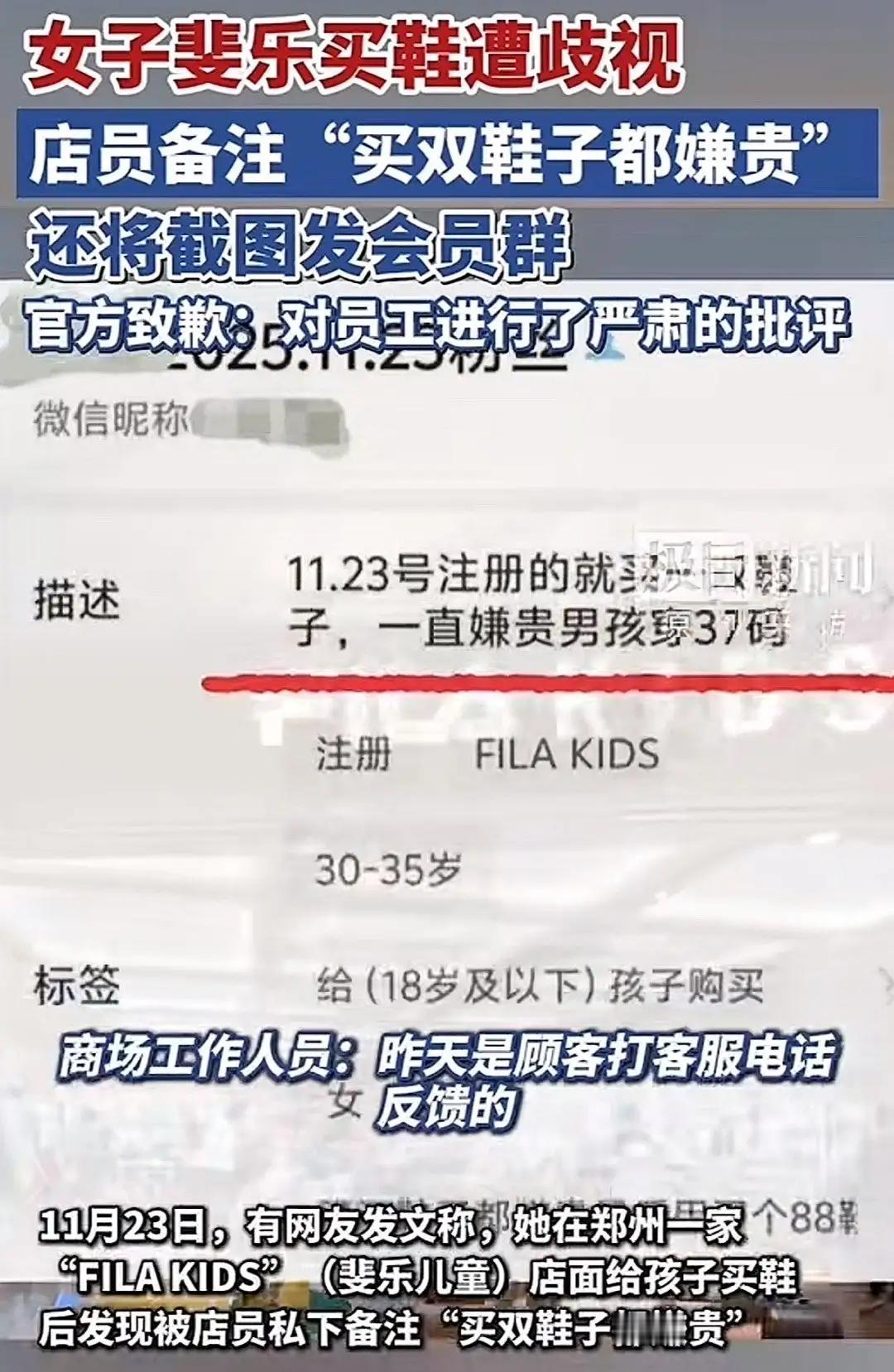 郑州有位宝妈,去斐乐儿童店给孩子买鞋,前后不到十分钟,试了三双就爽快付钱,连用券都是店员提议的,结果转头就发现,自己被店员备注“买双鞋子都嫌贵”,还把这备注截图发到了会员群里! 更可气的是,她在群里要个说法,店长没半句实在话,反手就把群给解散了,这哪是解决问题,分明是堵人的嘴。 后来才知,这店员的“杰作”不止一处,另一位顾客被标上“绑定奥莱,不能用就换老公注册”,字里行间全是轻慢。 穿上件品牌工服,就把东家的牌子当自己的底气,对着顾客论三六九等,真把自己当根葱了? 消费者权益保护法写得明明白白,人格尊严受保护,个人信息不能乱传,这些人偏当耳旁风 。 品牌方出来道歉,只说“严肃批评”,这般轻描淡写,怕不是觉得顾客的委屈不值一提? 花钱消费,买的是商品,不是受气。精打细算过日子是本分,哪就成了被嘲讽的由头? 店员的傲慢,是职业素养的缺失;品牌的敷衍,是对消费者的漠视。再响亮的口号,也经不住这般消耗。 大家替宝妈抱不平,说到底是怕自己遇着同款糟心事——谁愿花钱买东西,还被人在背后嚼舌根、贴标签? 一双鞋再贵,也撑不起扭曲的优越感;一个品牌再大,没了尊重顾客的初心,迟早会凉。 你消费时遇过区别对待吗?要是被偷偷贴难听标签,你会怎么应对?欢迎在评论区说说你的经历!