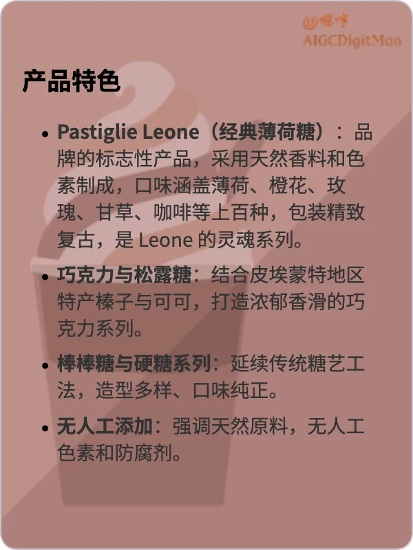 如今,Leone 仍保持家族式经营,秉承传统配方与手工技艺,同时推出现代创新系列,产品出口全球多个国家。