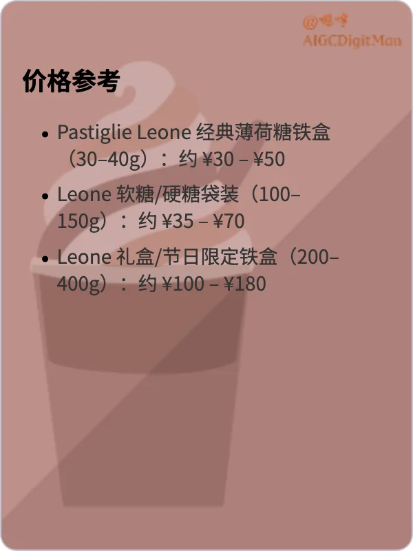 Leone 礼盒/节日限定铁盒(200–400g):约 ¥100 – ¥180