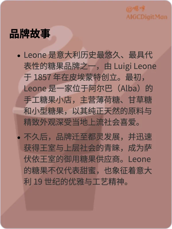 Leone 是意大利历史最悠久、最具代表性的糖果品牌之一,由 Luigi Leone 于 1857 年在皮埃蒙特创立。