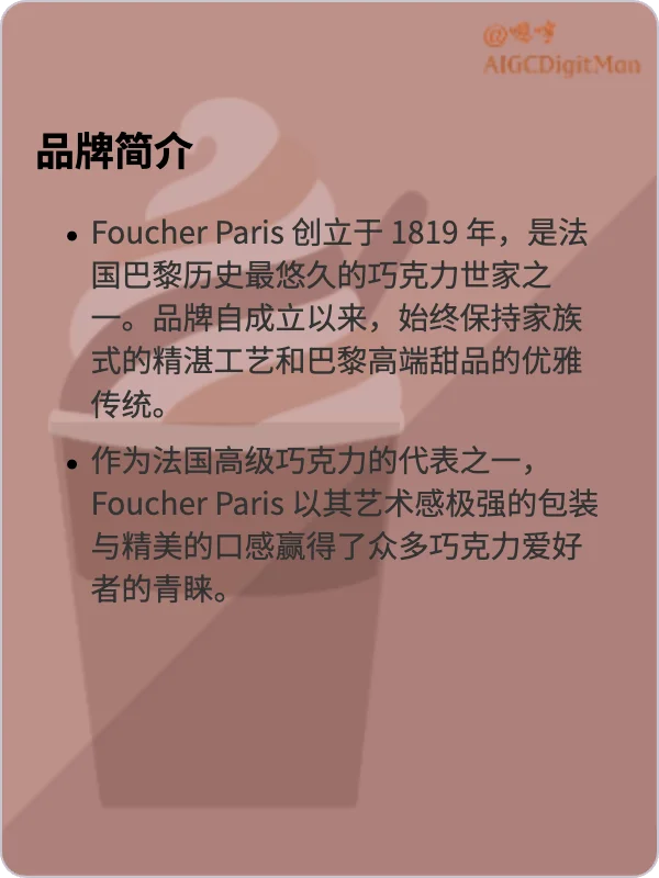 Foucher Paris 创立于 1819 年,是法国巴黎历史最悠久的巧克力世家之一。