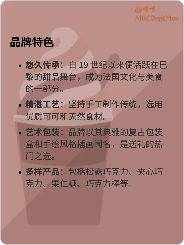悠久传承:自 19 世纪以来便活跃在巴黎的甜品舞台,成为法国文化与美食的一部分。