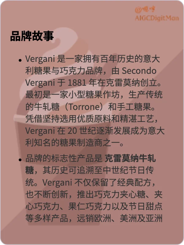 Vergani 是一家拥有百年历史的意大利糖果与巧克力品牌,由 Secondo Vergani 于 1881 年在克雷莫纳创立。