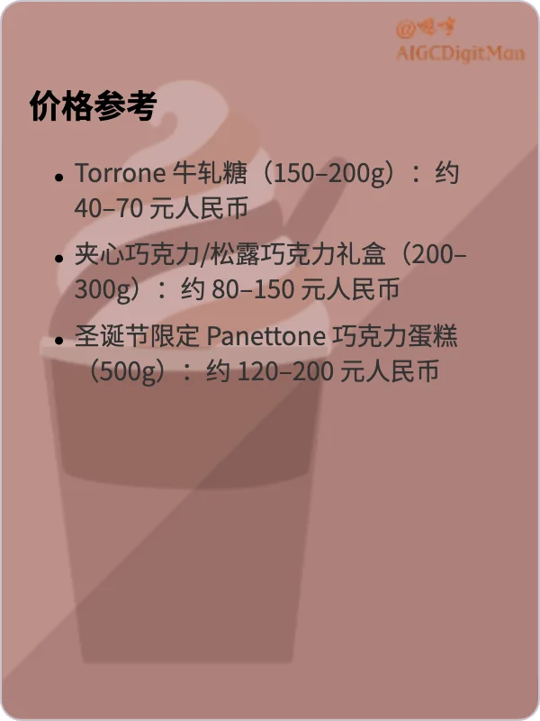 Torrone 牛轧糖(150–200g):约 40–70 元人民币
