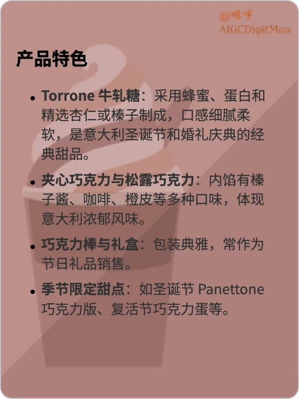 品牌的标志性产品是 克雷莫纳牛轧糖,其历史可追溯至中世纪节日传统。