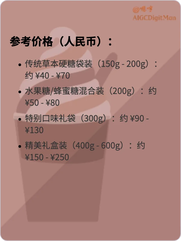 传统草本硬糖袋装(150g - 200g):约 ¥40 - ¥70
