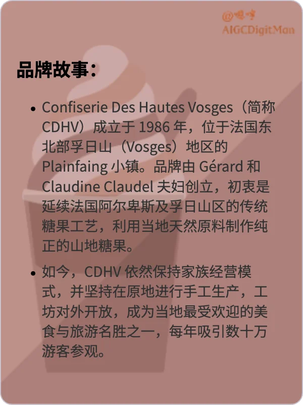 品牌由 Gérard 和 Claudine Claudel 夫妇创立,初衷是延续法国阿尔卑斯及孚日山区的传统糖果工艺,利用当地天然原料制作纯正的山地糖果。