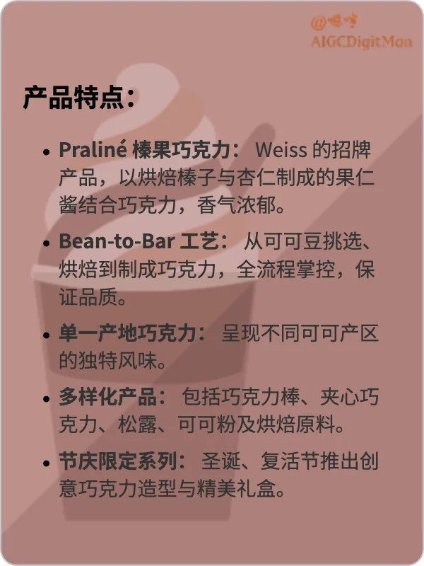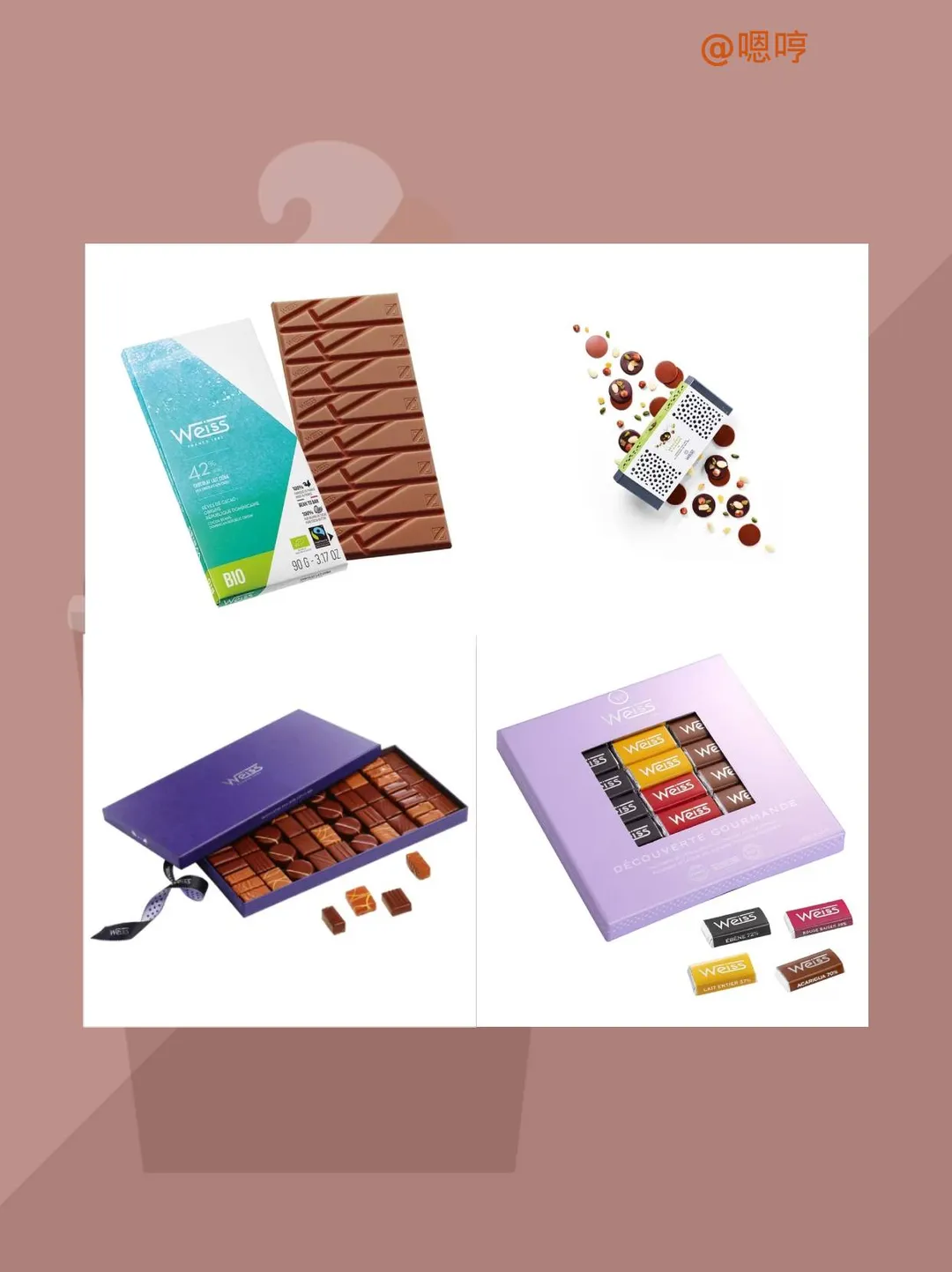 作为法国巧克力史上的先驱,Weiss 以“精选可可豆与法式工艺”著称,始终坚持 bean-to-bar 的理念,自行烘焙与调配可可豆,确保纯正风味。