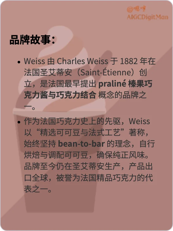 Weiss 由 Charles Weiss 于 1882 年在法国圣艾蒂安(Saint-Étienne)创立,是法国最早提出 praliné 榛果巧克力酱与巧克力结合 概念的品牌之一。