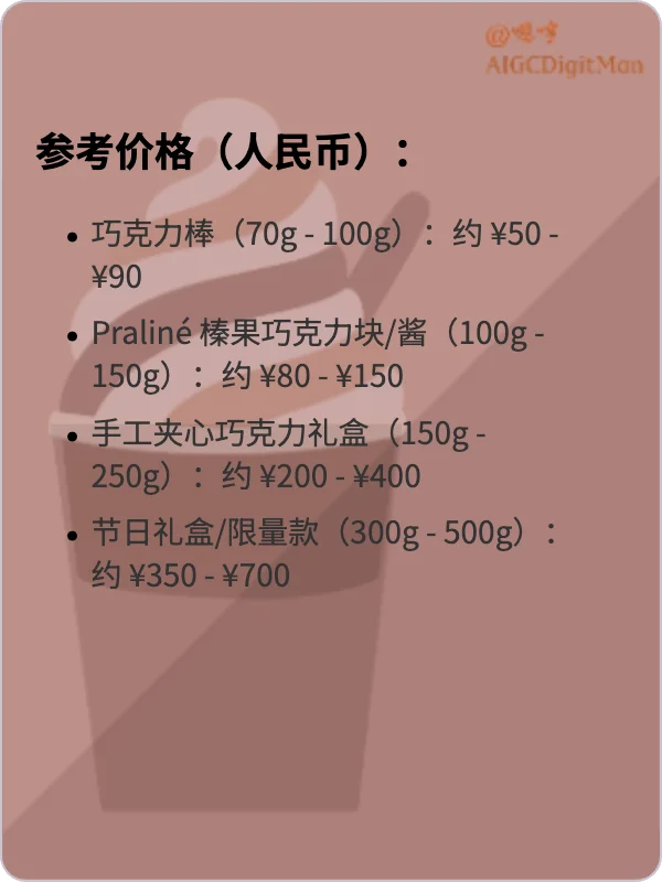 Praliné 榛果巧克力块/酱(100g - 150g):约 ¥80 - ¥150