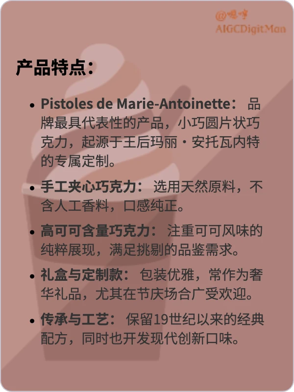 Pistoles de Marie-Antoinette: 品牌最具代表性的产品,小巧圆片状巧克力,起源于王后玛丽·安托瓦内特的专属定制。