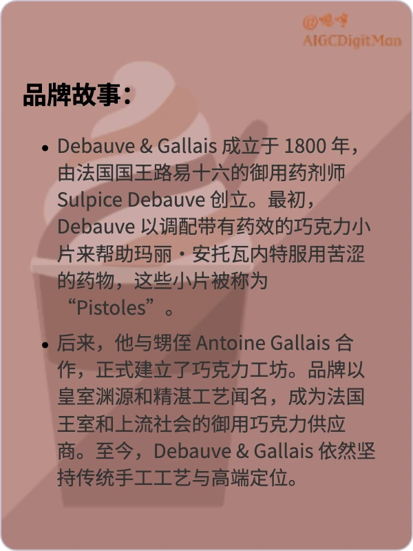 至今,Debauve & Gallais 依然坚持传统手工工艺与高端定位,被誉为法国历史最悠久、最具声望的奢华巧克力品牌之一。