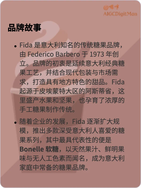 Fida 是意大利知名的传统糖果品牌,由 Federico Barbero 于 1973 年创立。