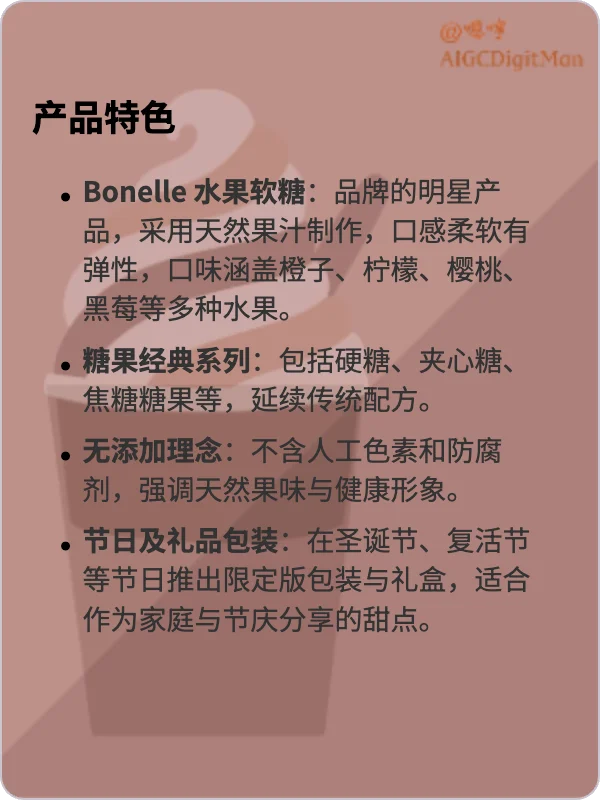 Bonelle 水果软糖:品牌的明星产品,采用天然果汁制作,口感柔软有弹性,口味涵盖橙子、柠檬、樱桃、黑莓等多种水果。